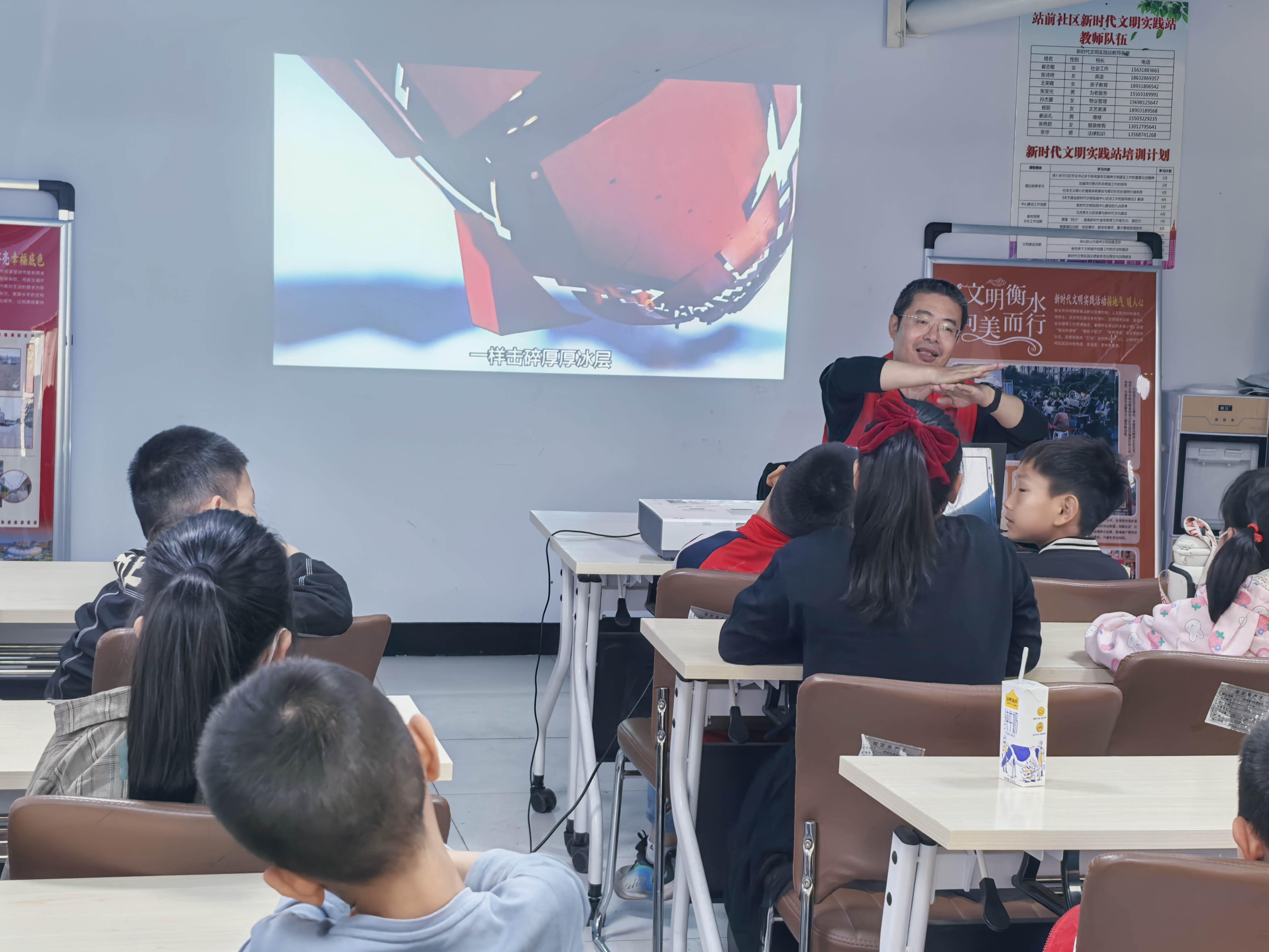 “破冰船仅船头钢板厚度就有5厘米,船体结实结构精巧,还有核动力推进,能砸碎坚冰。”当志愿者“山猫伯伯”张建华播放北极航线破冰船的讲解视频时,低保家庭的小雨(化名)瞪大了眼睛,第一次直观感受到科技带给世界的变化。线形图展示的气温变化曲线令全场哗然,冰川融化的视频更让孩子们惊叹不已……“山猫伯伯”用视频、图片和互动问答,将全球气候、科技发展、政治生态等“大课题”化为孩子们眼中的“新世界”,共同探索着北极航线背后的奥秘。