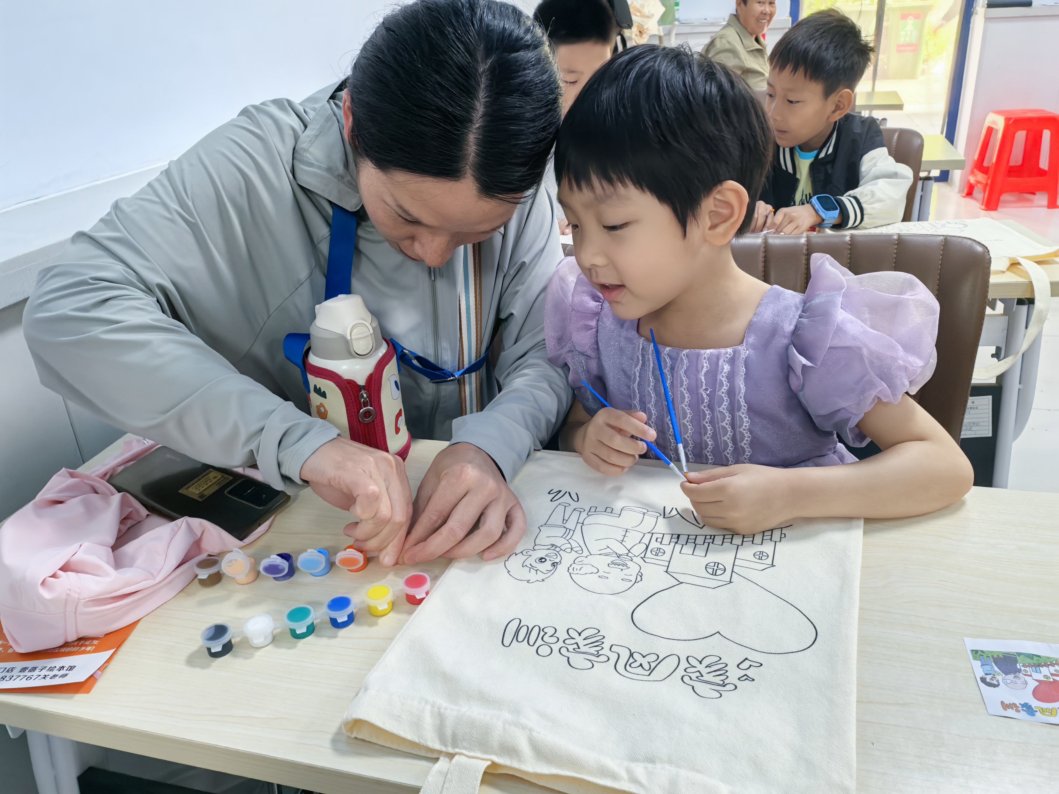 活动尾声,家长与孩子们共读绘本《小粽子小粽子》,欢乐的空气中仿佛弥漫着粽子的清甜。随后,在志愿者的帮助下,孩子们用手绘颜料DIY绘制帆布包,现场笑声不断。