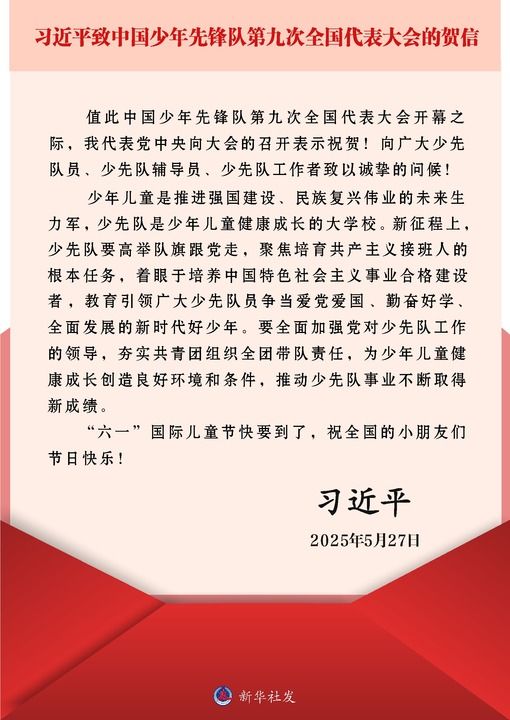 来源:新华社原标题:习近平致信祝贺中国少年先锋队第九次全国代表大会召开