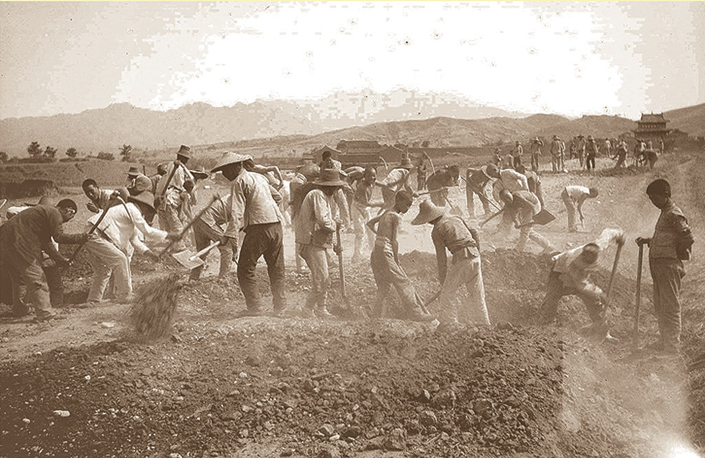 群众们握紧着自己的铁锹、大镐