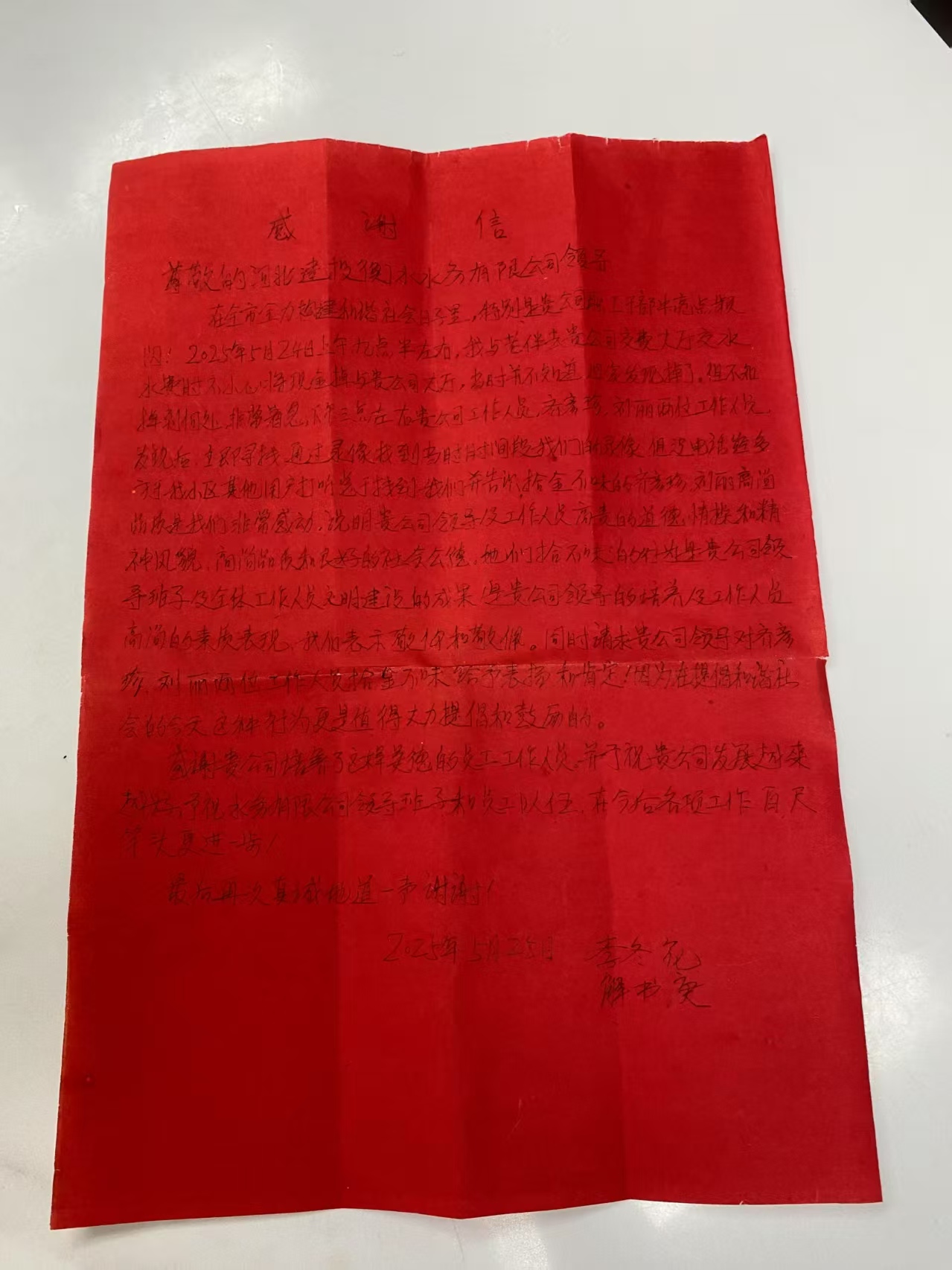 5月25日一早,一位老人手持一封用大红纸工整书写的感谢信,专程来到河北建投衡水水务有限公司客服中心,对公司员工拾金不昧的高尚品德和高效贴心的服务表达由衷感激。