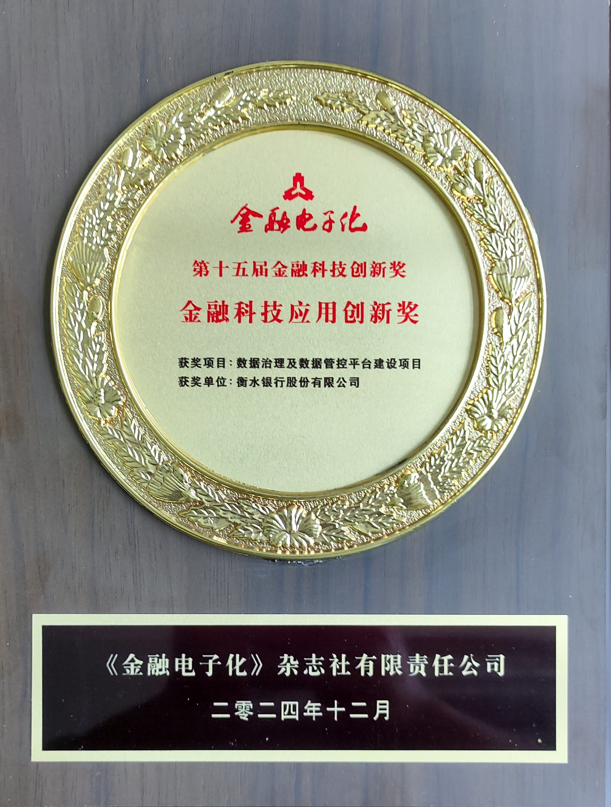 去年末,在“智领金融新生态 数绘未来新业态”为主题的2024年金融科技年会上,由中国人民银行旗下《金融电子化》杂志社主办的“第十五届金融科技创新奖”评选结果正式揭晓,衡水银行“数据治理及数据管控平台建设项目”凭借在推进数字化变革创新方面的优异表现,一举夺得“金融科技应用创新奖”。