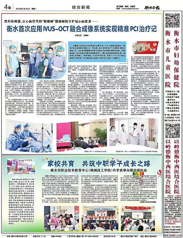 日前,衡水市人民医院(哈励逊国际和平医院)心血管内科利用IVUS-OCT融合成像系统,为一名81岁高龄冠心病患者成功开展右冠PCI治疗,开启了衡水冠心病精准介入治疗的新纪元,一举走在了全国前列。5月10日,致力于心血管领域高质量的学术传播的全国知名期刊《门诊》杂志,以《融合成像,相倚为强|衡水市人民医院成功应用IVUS- OCT融合成像系统NO-VASYNC实现精准PCI治疗》为题进行了专题报道,引发了良好反响。