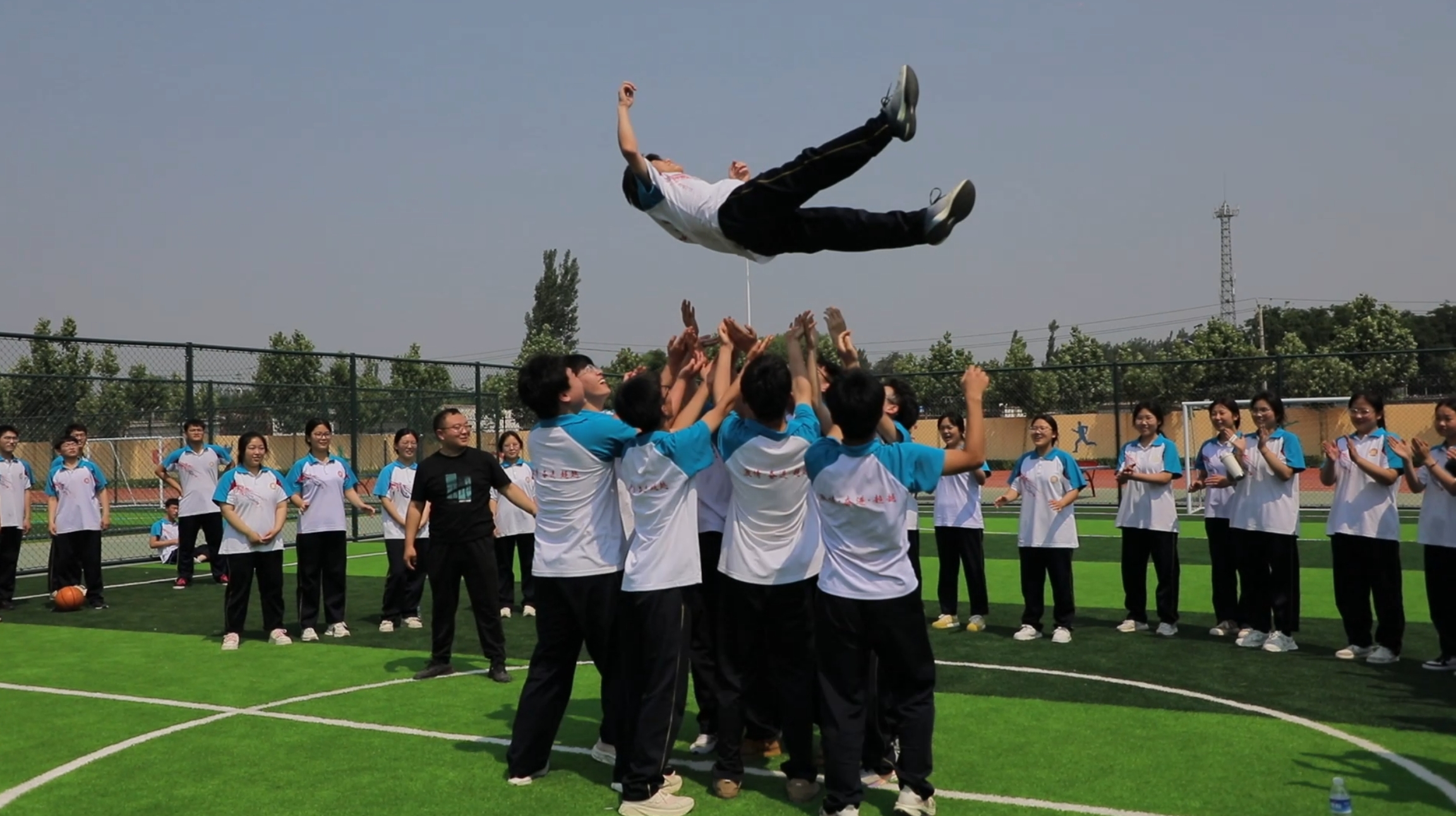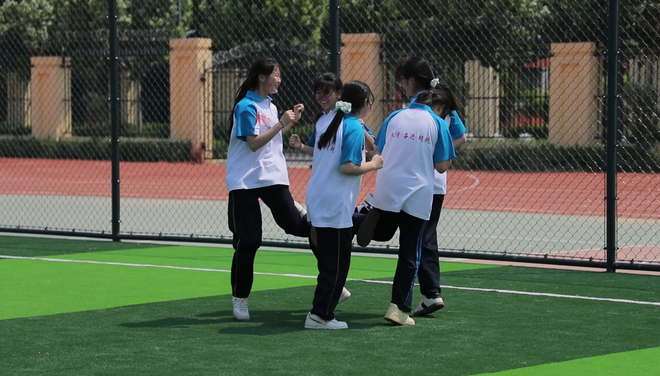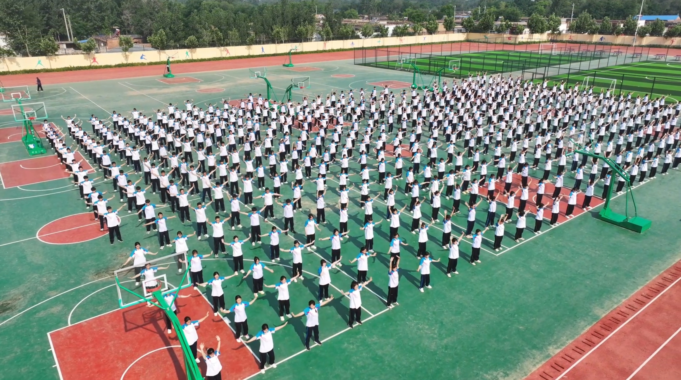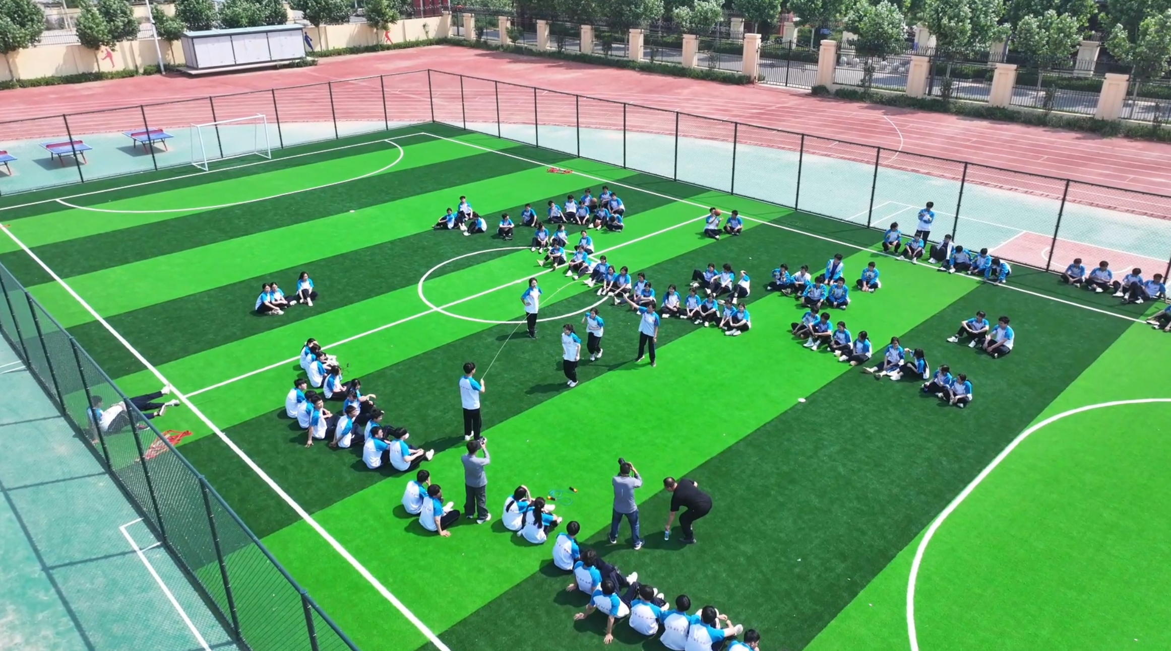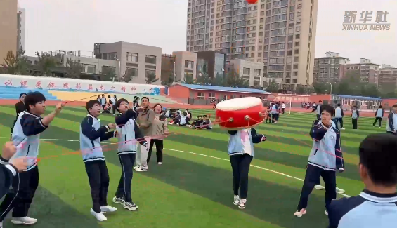 在学校操场上,八段锦、兔子舞、“三人两足”、多人跳绳等活动有序开展。在八段锦的练习现场,同学们身着校服,整齐排列,跟随老师的口令,一招一式、刚柔并济,在舒缓的动作中感受身心的放松。兔子舞区域则充满了欢声笑语,同学们手拉手,随着欢快的音乐节奏蹦跳前行,青春的活力肆意绽放。“三人两足”比赛现场,参赛小组们齐心协力、步伐一致,向着终点奋力冲刺,现场加油声、欢呼声此起彼伏。多人跳绳活动中,同学们默契配合,绳子在空中快速飞舞,大家尽情享受着运动带来的快乐。