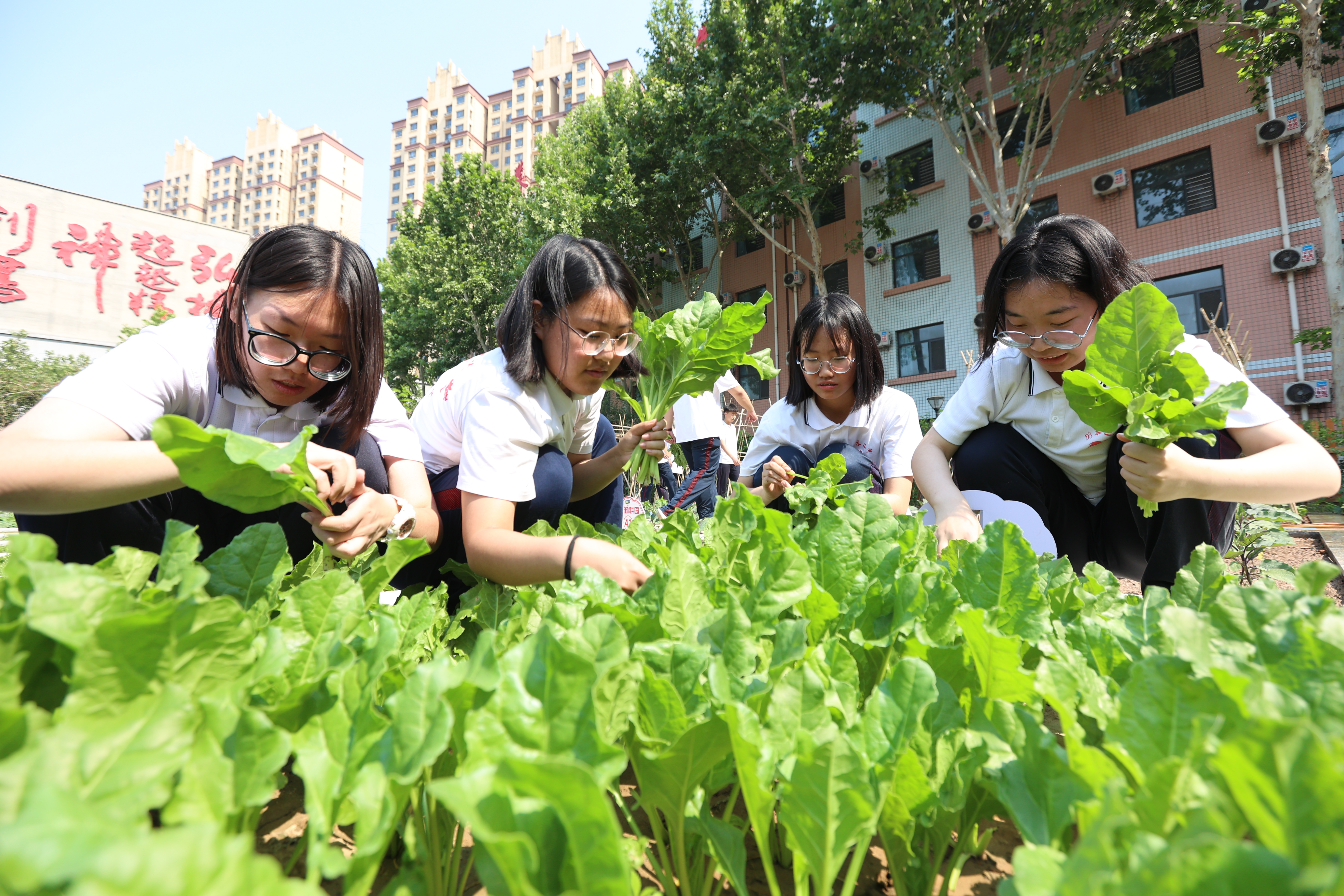 衡水市第二中学高三学生在劳动实践基地里采摘蔬菜,让高三学子在劳动中舒缓身心、感受丰收喜悦