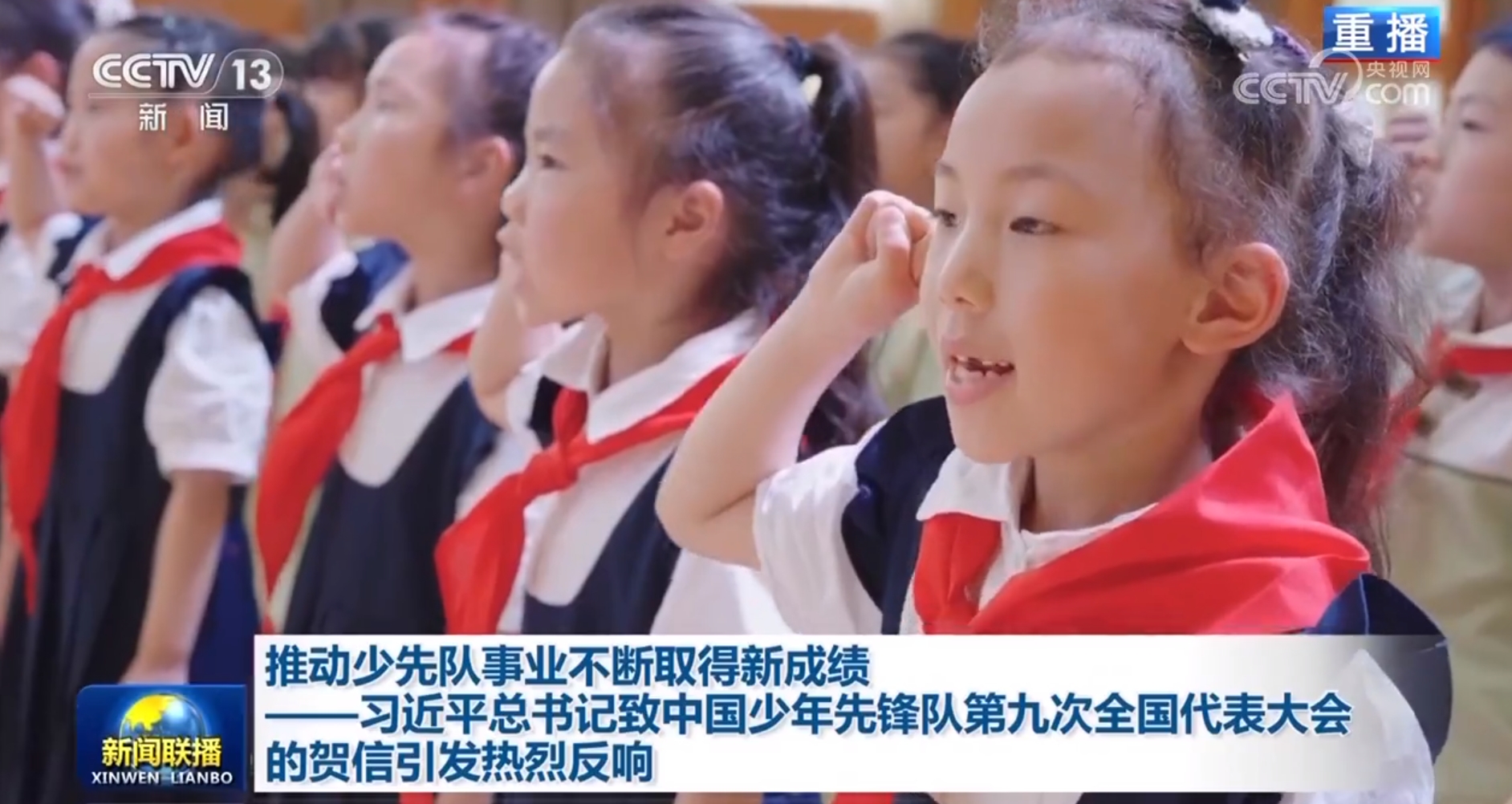 央视网消息(新闻联播):习近平总书记在致中国少年先锋队第九次全国代表大会的贺信中强调,要聚焦培育共产主义接班人的根本任务,着眼于培养中国特色社会主义事业合格建设者,教育引领广大少先队员争当爱党爱国、勤奋好学、全面发展的新时代好少年。总书记的殷切寄语在广大少先队员、少先队辅导员、少先队工作者中引发热烈反响。