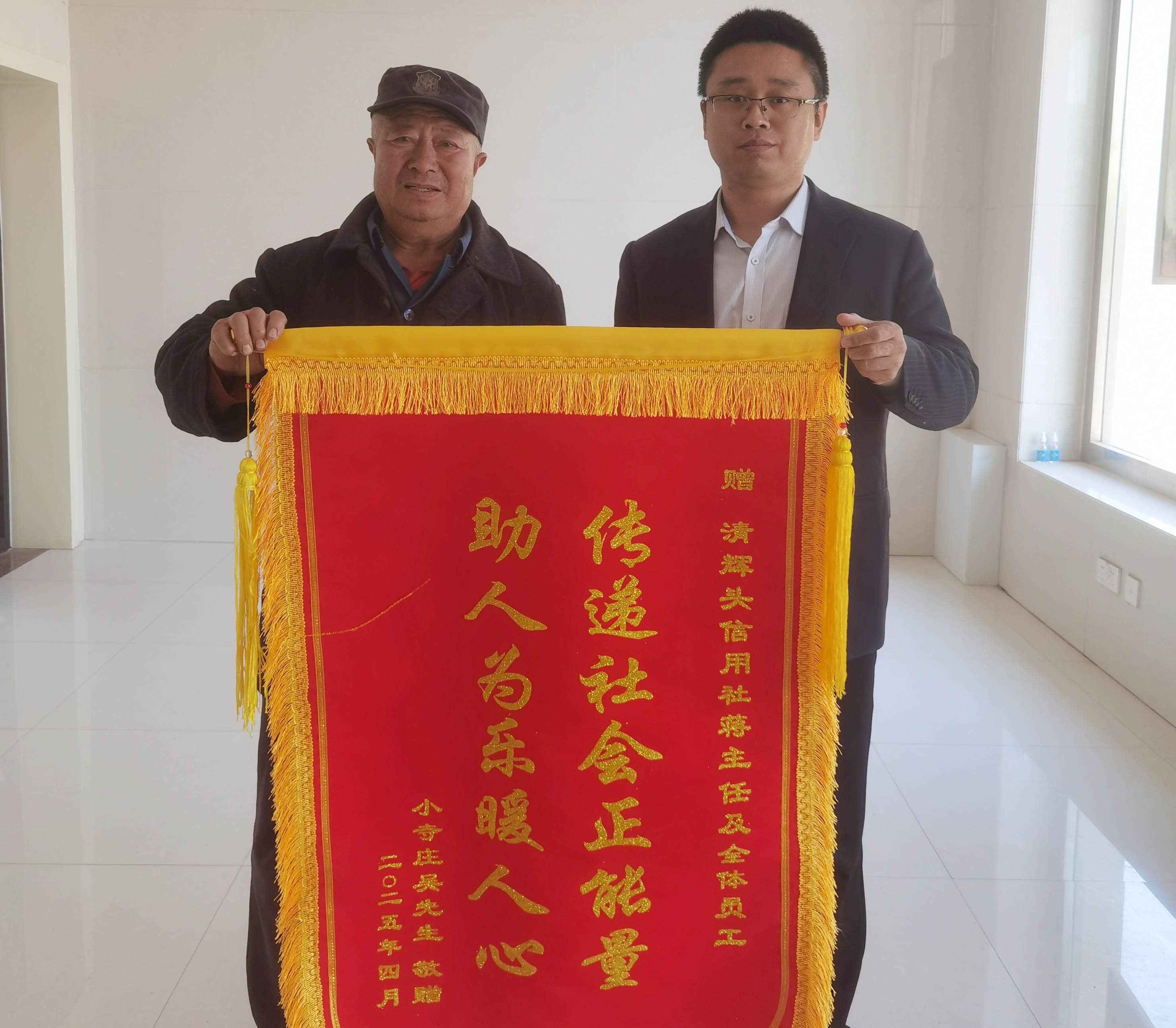 3天后,吴先生特意带着精心制作的锦旗再次来到网点。“那天回家越想越感动,你们的服务不是简单的‘完成任务’,是真的把客户放在心上。”吴先生将锦旗交到蒋兆旭手中,锦旗上“传递社会正能量 助人为乐暖人心”14个金色大字格外醒目。