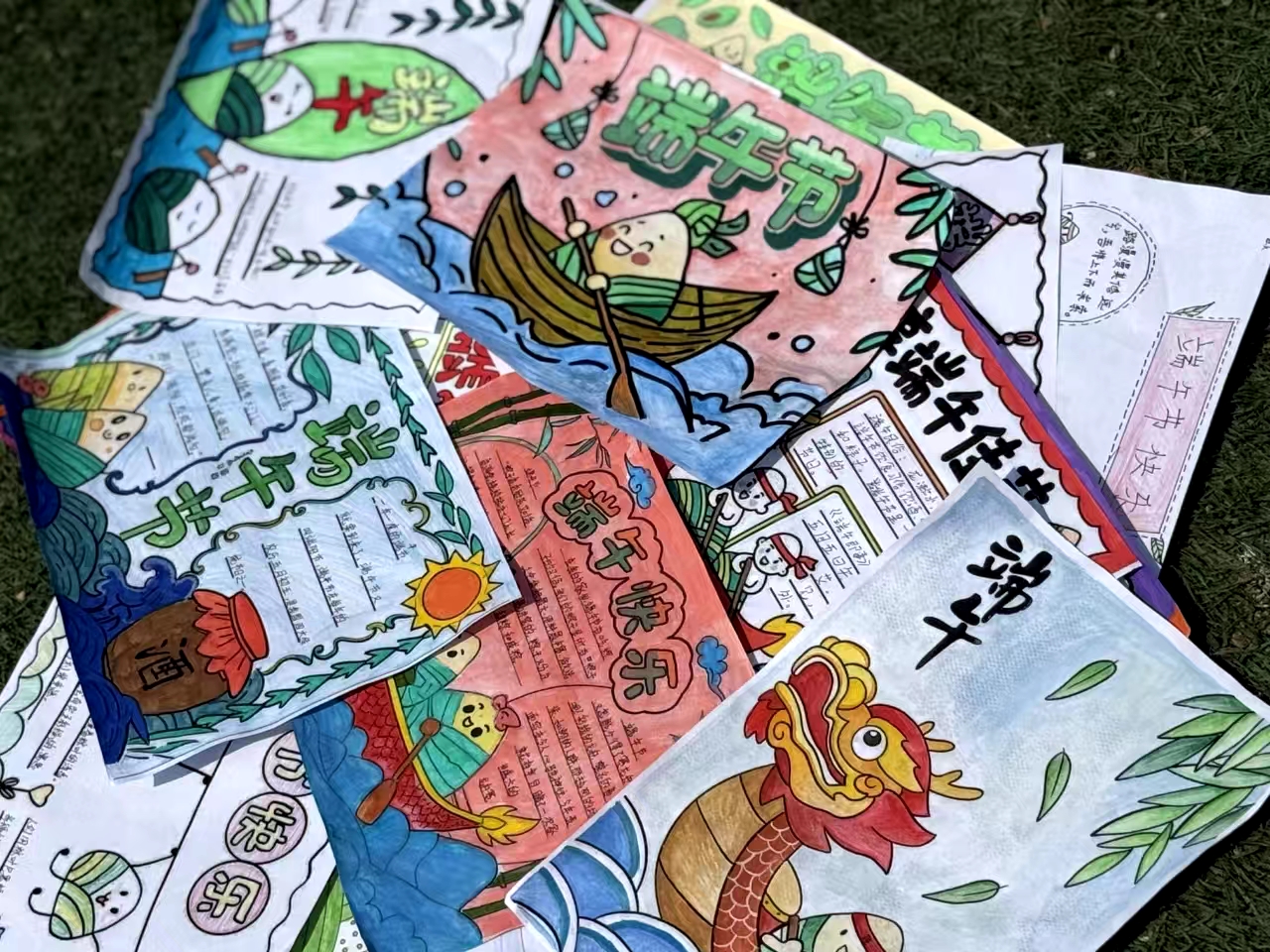 课后,学生们以纸为媒、以笔代言,拿起画笔开始了自由创作,有的以龙舟为主题展开描绘,有的以粽叶造型勾勒边框,有的将自己喜爱的卡通形象赋予端午色彩……一幅幅精美的作品跃然纸上,以丰实的笔触和饱满的热情,营造着传统节日的欢乐氛围。学生们将天马行空的想象力在画纸上尽情挥洒,每一笔色彩、每一个图案,都承载着他们对端午节满满的祝福和美好的希望。