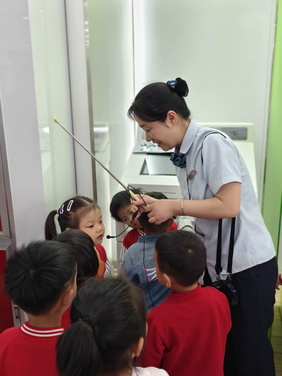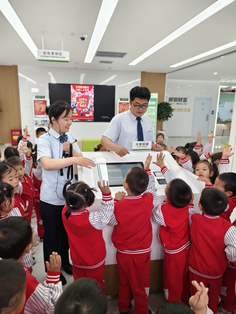 在银行工作人员的带领下,小朋友们依次参观了银行营业厅智能服务区和理财咨询区,体验叫号机、ATM自助存取款,认识各类金融产品, 通过"看一看、试一试"的互动方式,孩子们建立起对银行职能的直观认知。