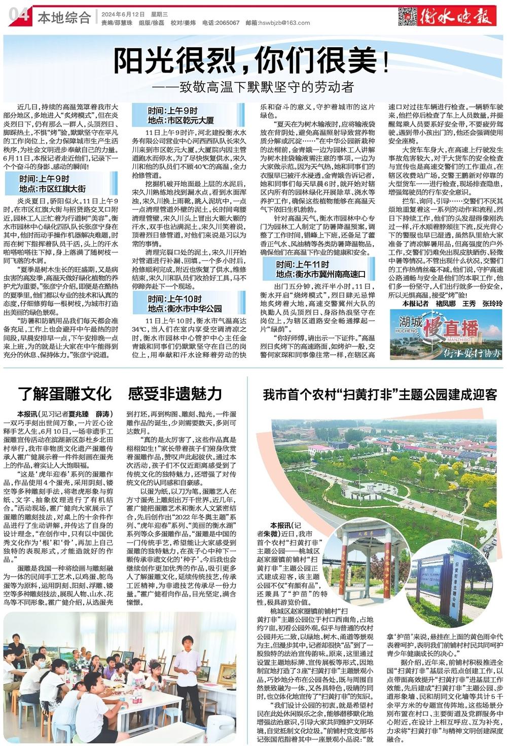《衡水晚报》2024年6月12日04版“湖城慢直播”栏目刊发《阳光很烈,你们很美!——致敬高温下默默坚守的劳动者》