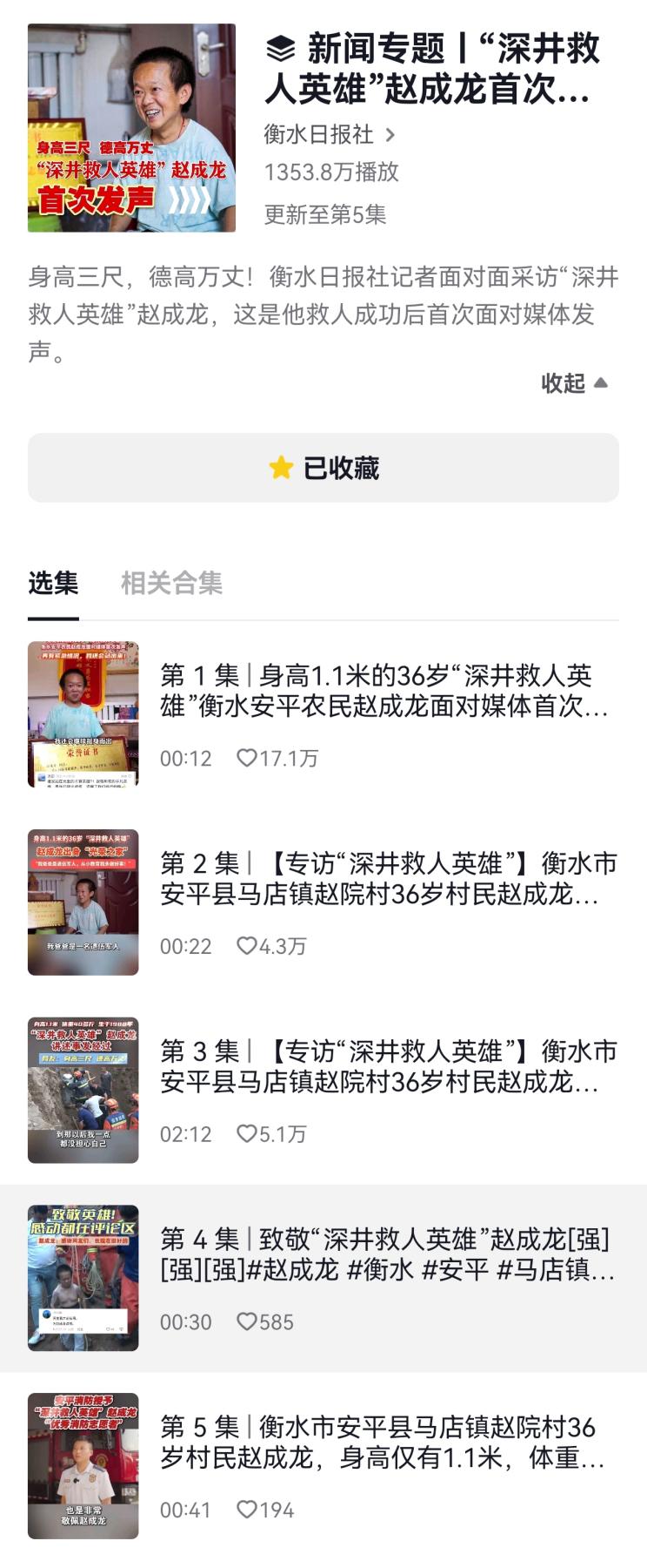 衡水日报社抖音号2024年6月推出《新闻专题丨“深井救人英雄”赵成龙首次发声》