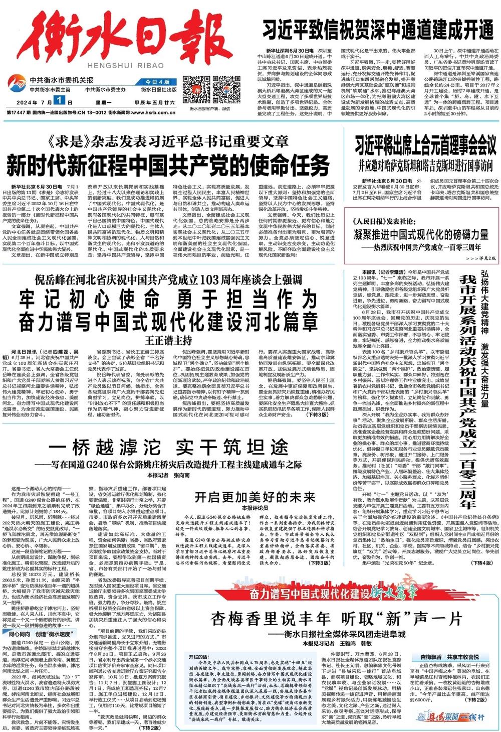《衡水日报》2024年7月1日头版刊发《一桥越滹沱 实干筑坦途——写在国道G240保台公路姚庄桥灾后改造提升工程主线建成通车之际》
