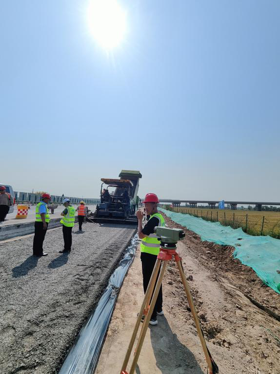 施工现场机械轰鸣、人员忙碌。大型摊铺机稳步推进,均匀铺设水稳材料。施工人员身着反光背心、头戴安全帽,各司其职——测量人员紧盯仪器,精准把控摊铺平整度和厚度;辅助人员紧随摊铺机,及时调整细节,确保施工质量达标。