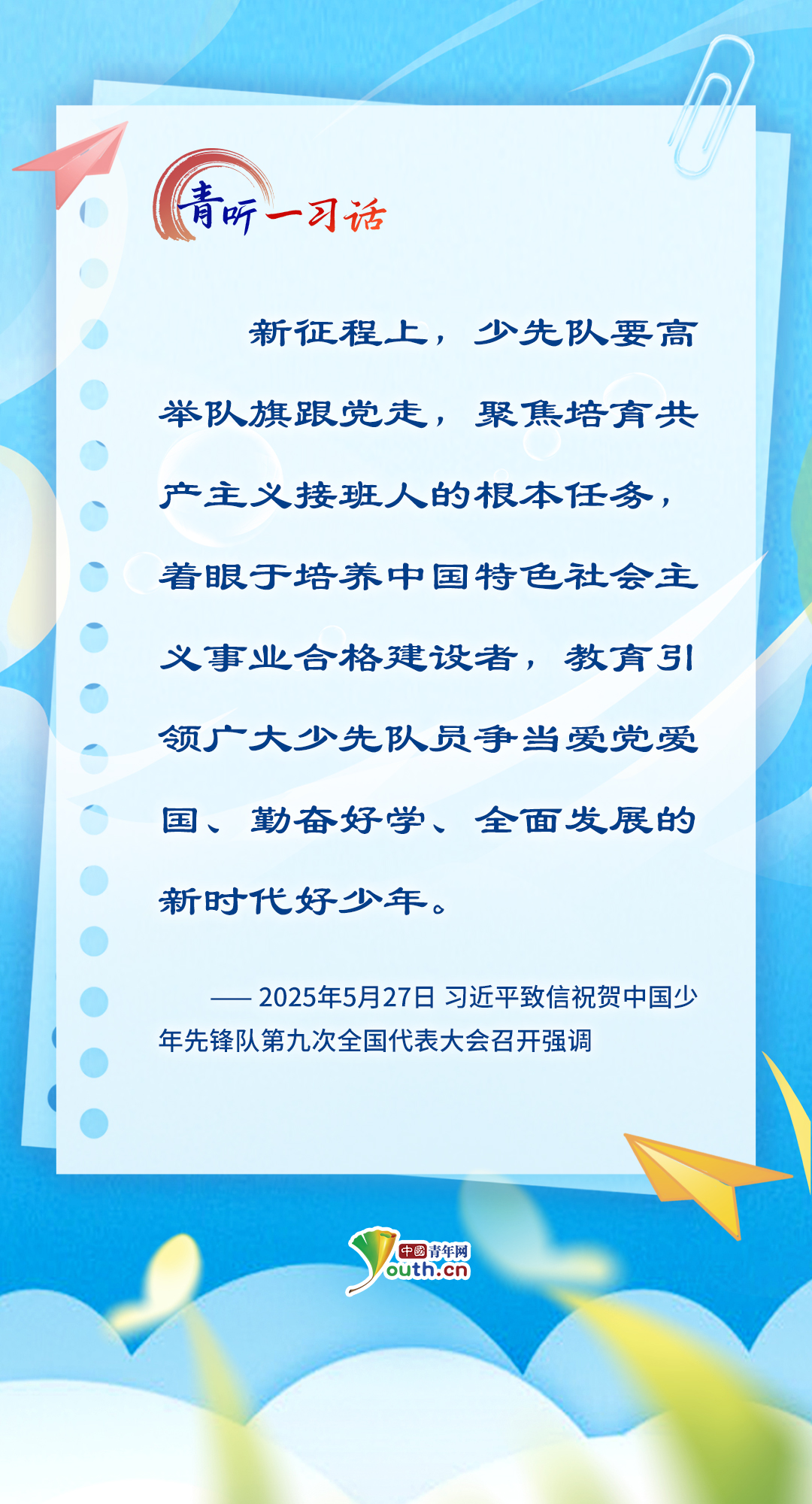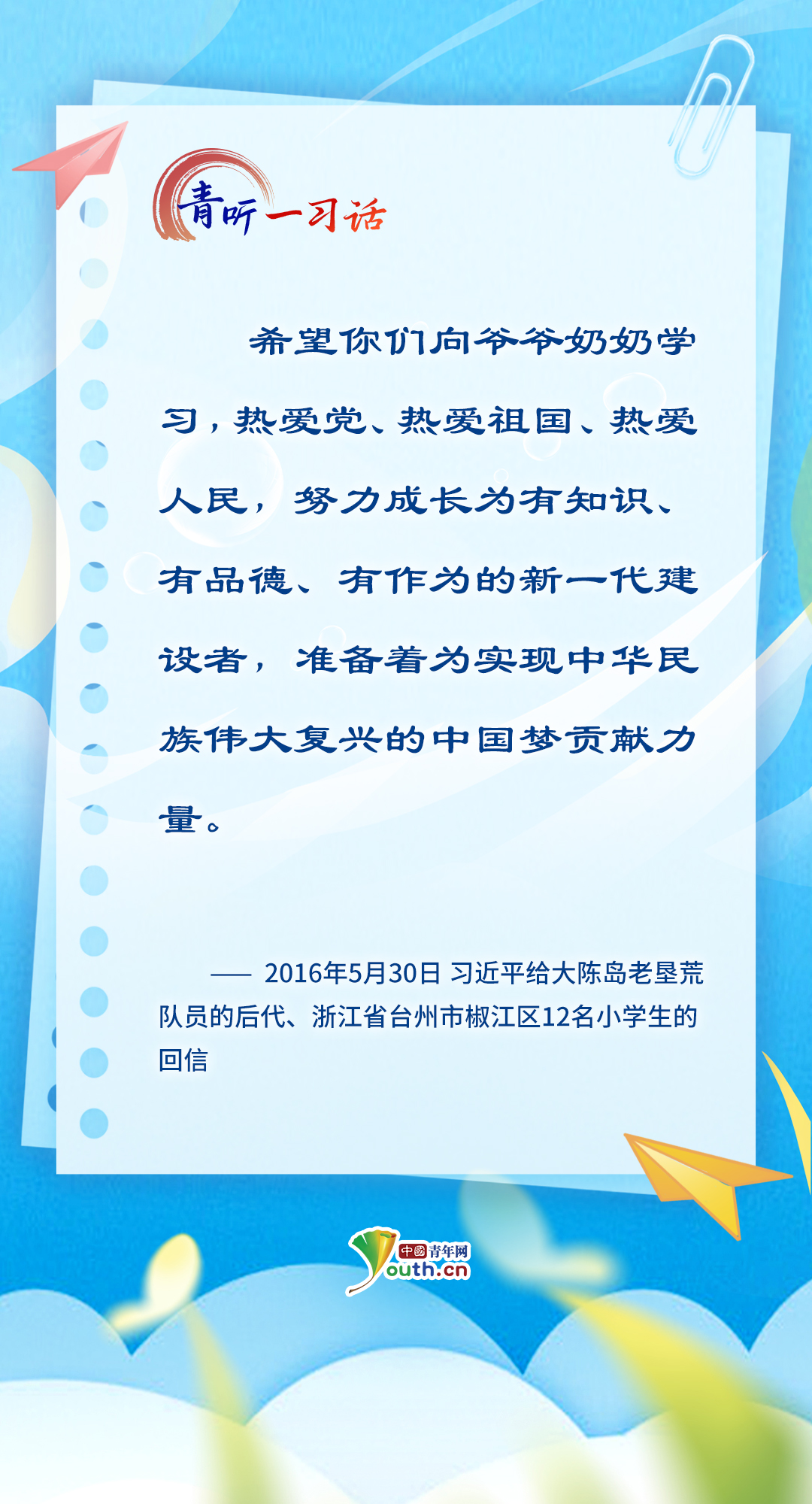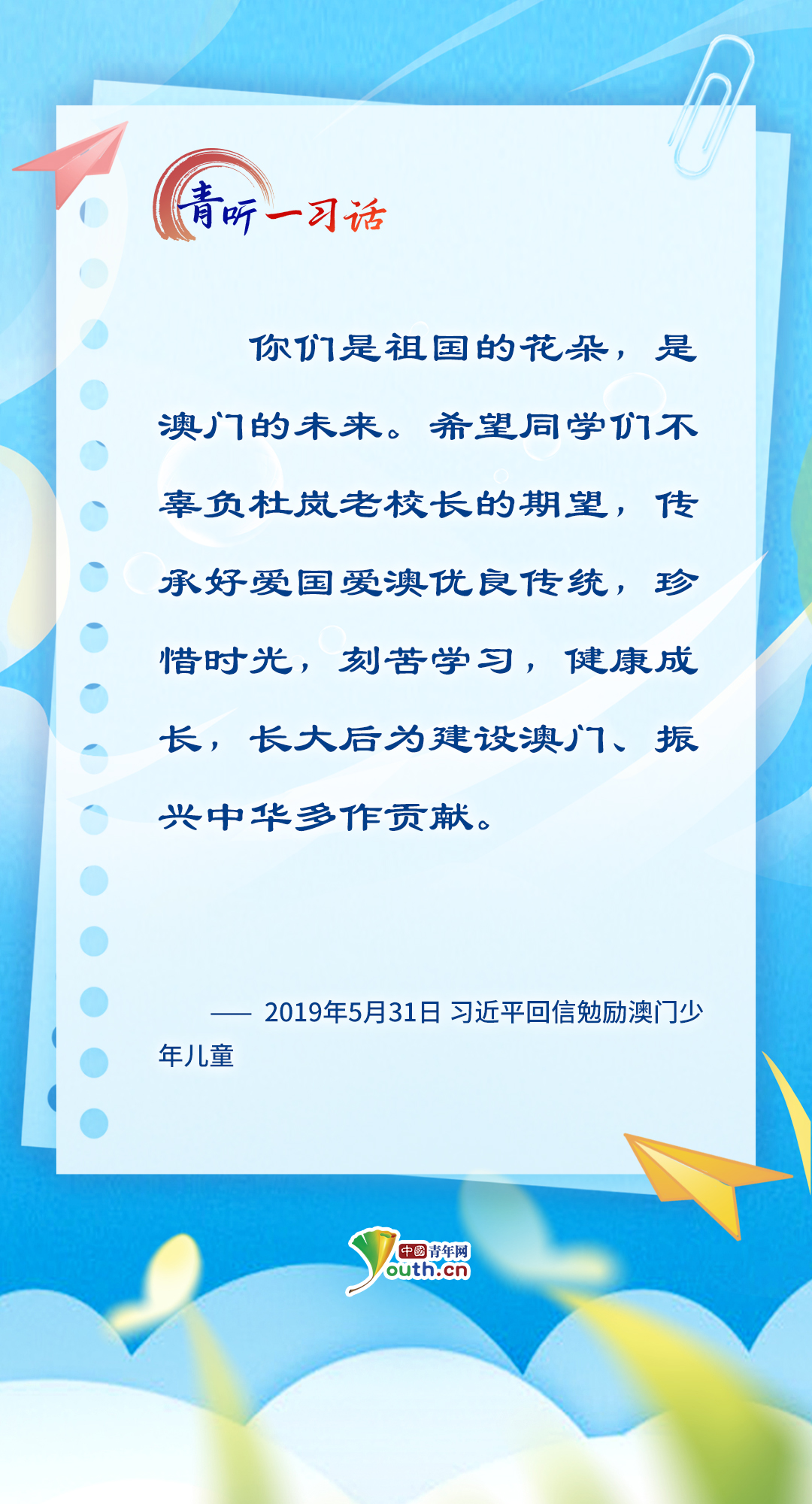 中国青年网北京6月1日电(记者 宋莉 曾繁华)“孩子们成长得更好,是我们最大的心愿。”党的十八大以来,习近平总书记关心关爱少年儿童成长成才,为少先队工作指明前进方向,从“六一”国际儿童节的殷殷寄语,到外出考察时的点滴关怀……少年儿童的健康成长和全面发展,一直是总书记心中最温柔的牵挂。在今年“六一”国际儿童节到来之际,让我们一起重温总书记对少年儿童的谆谆教诲、美好祝愿,感受总书记对少年儿童的深情牵挂、殷切期望。(海报制作:张洁)