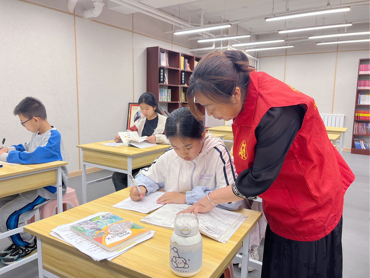 志愿者辅导孩子功课。孙林芝 摄
