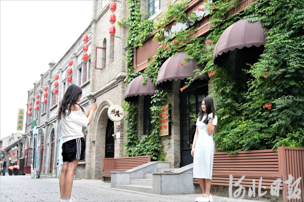 5月31日,游客在保定西大街特色店铺前拍照留念。河北日报记者许佳奇摄