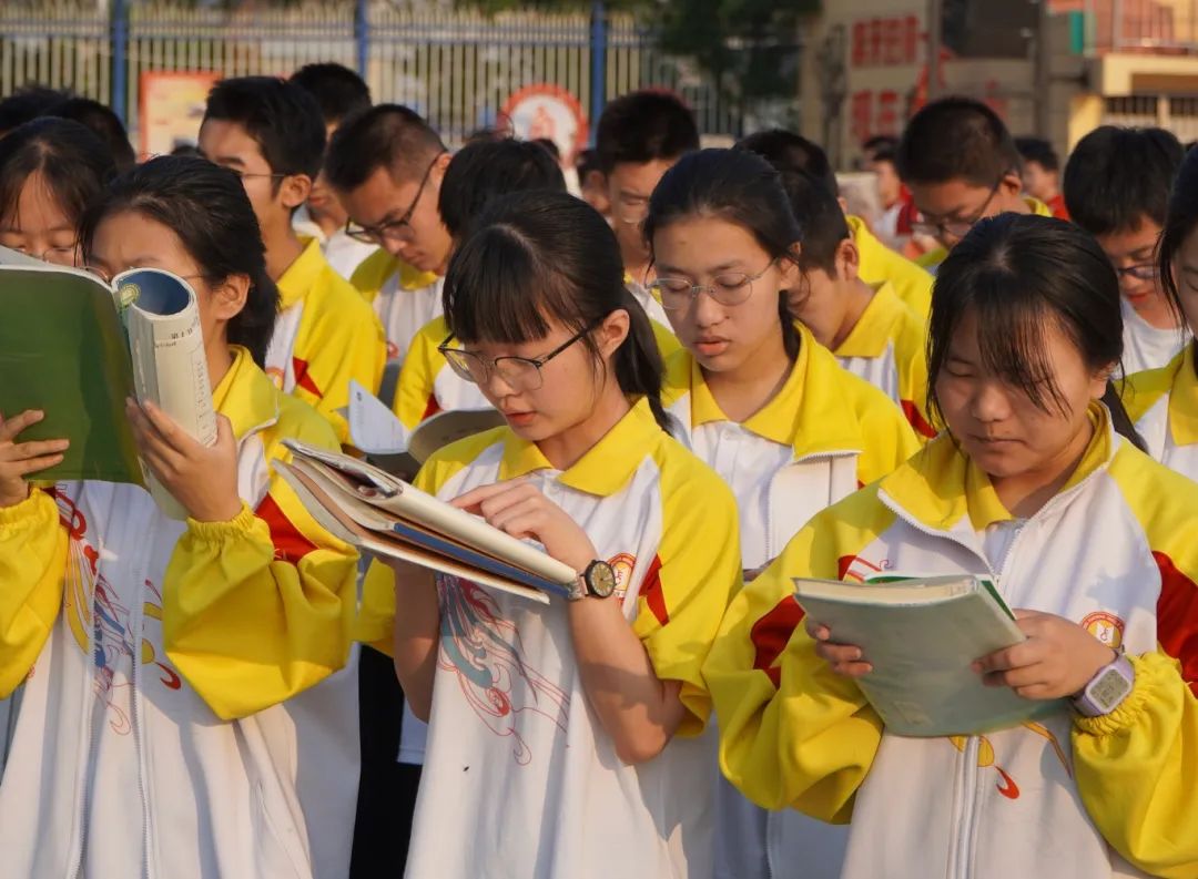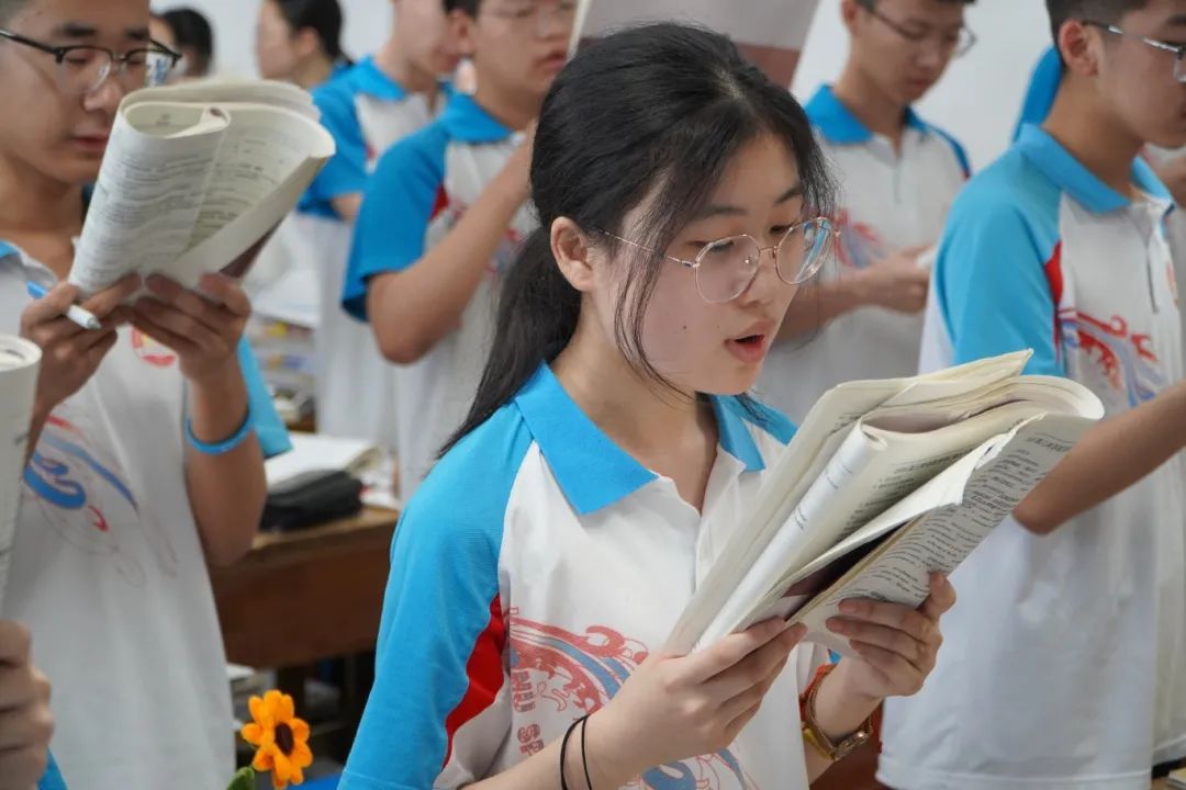 教室里,任课教师早已到达班级,并在黑板上布置好晨读任务。同学们稍作整理,便迅速投入激情满满的背诵中。他们全神贯注,声音响亮。晨光从窗户溜进教室为他们助威,照亮课本,也照亮他们眼中的炽热。