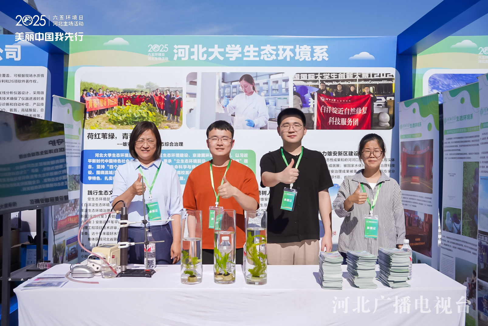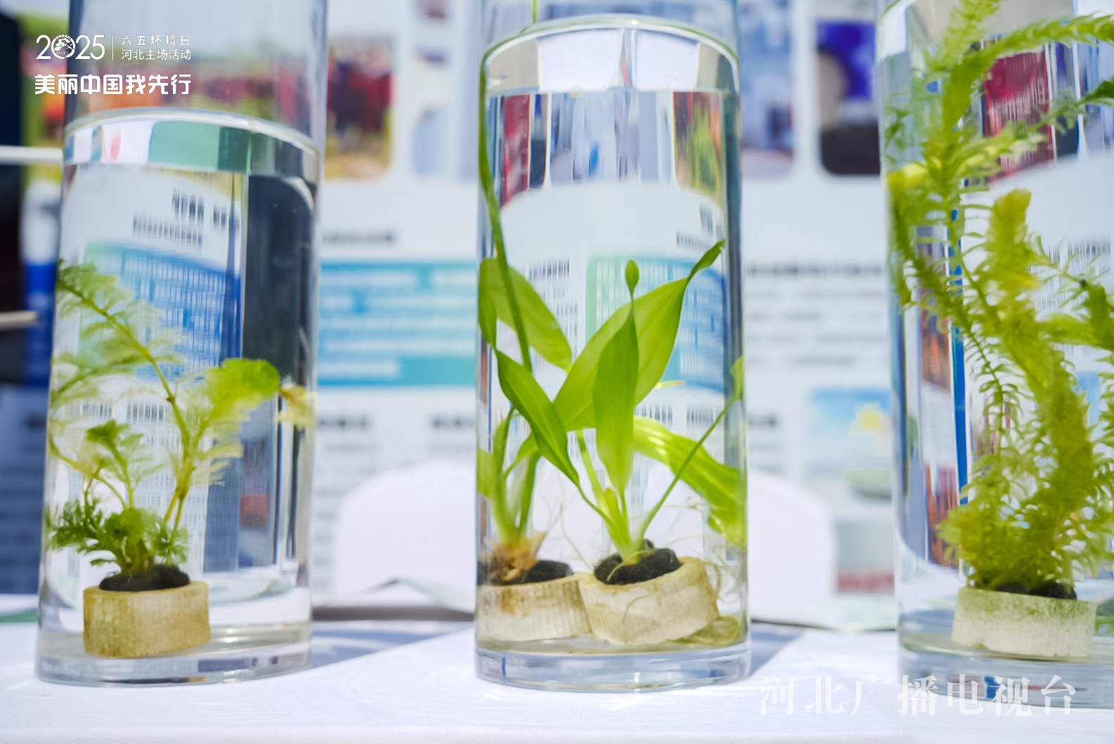 在活动现场的生态展览区,环保无人机、污染物降解装置、光伏发电、白洋淀水生植物样本等实物展示着河北生态领域的科研创新、校园与企业的环保实践。