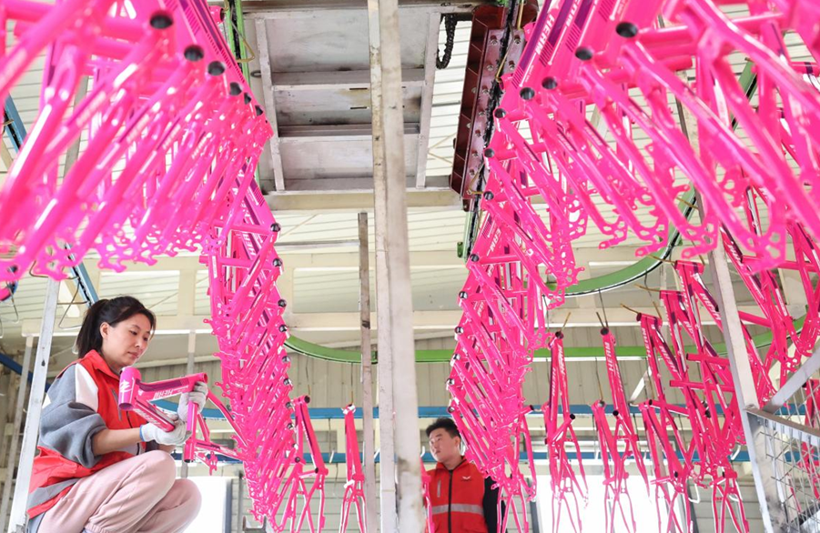 生产车间里,工人正在整理自行车车架。柴更利 摄