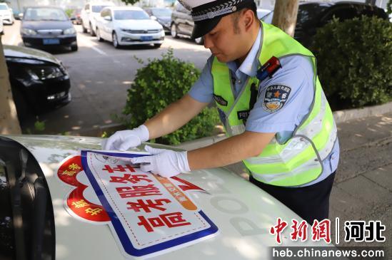 交警正在张贴高考服务车标识。 衡水市公安交通警察支队 供图