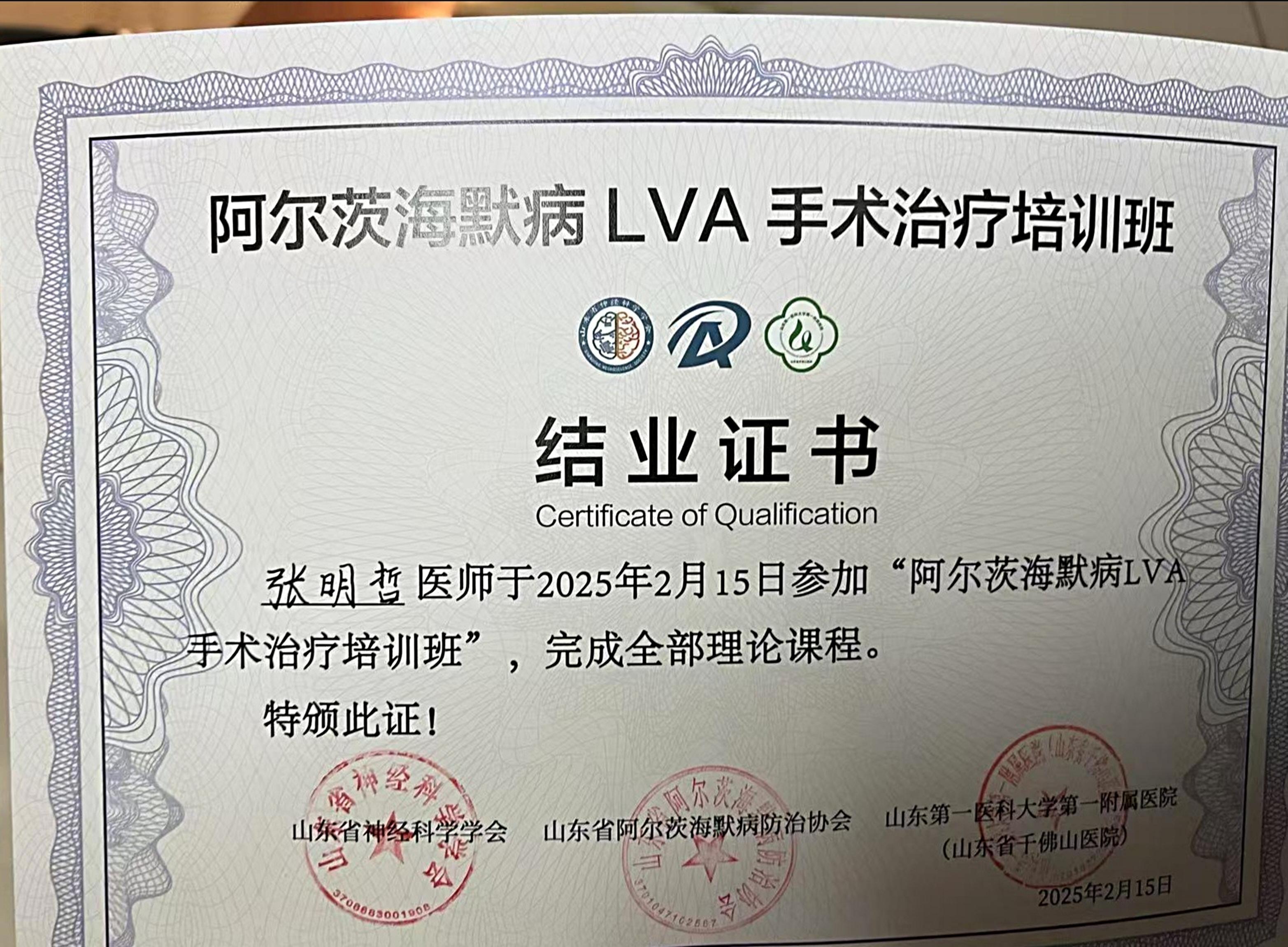 今年2月15日,张明哲获邀参加了山东省神经科学学会、山东省阿尔茨海默病防治协会主办的首届阿尔茨海默病LVA手术治疗培训班暨阿尔茨海默病多学科诊疗联盟启动大会,经过严格培训考核,获得各项资格认证。