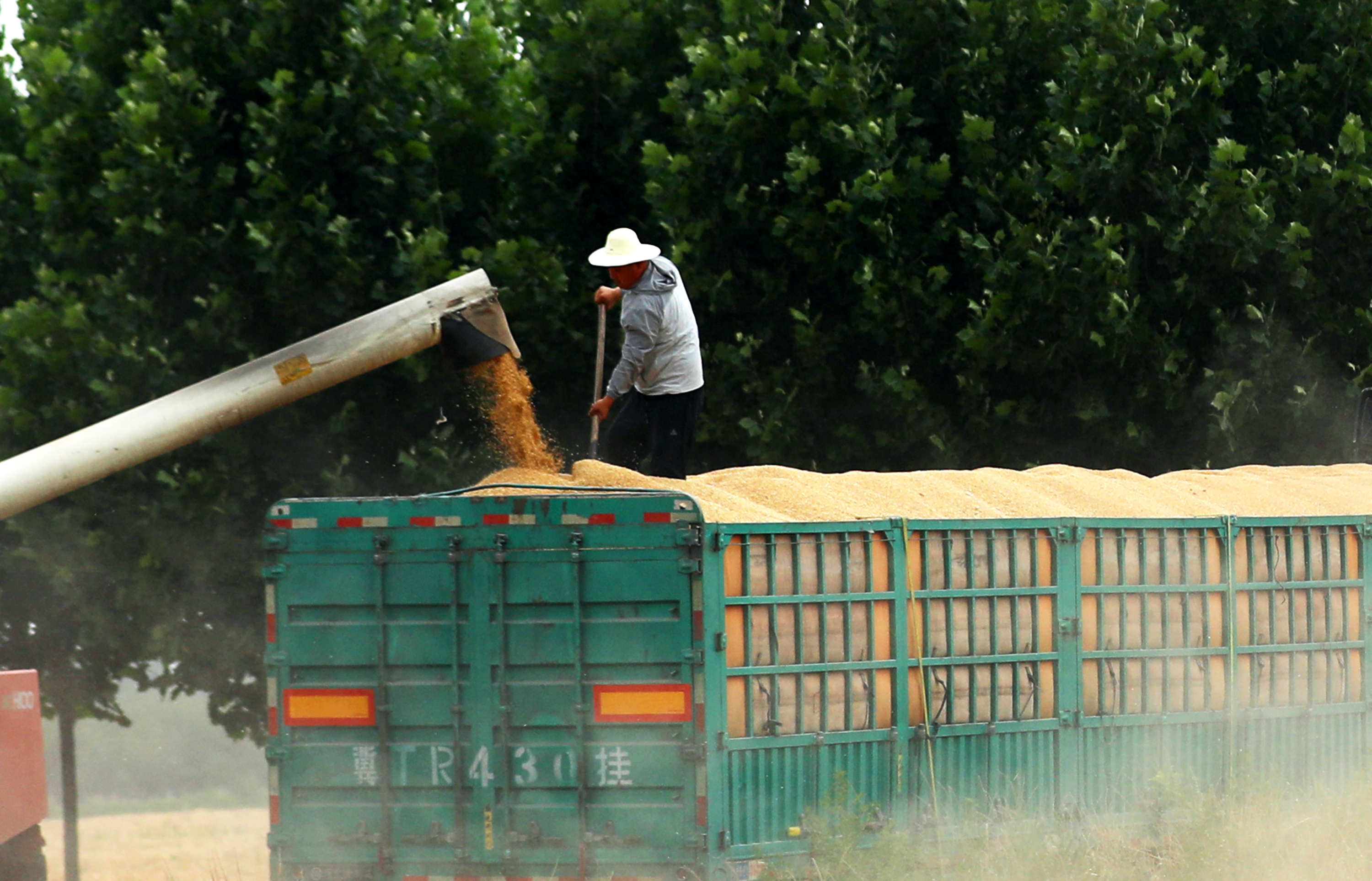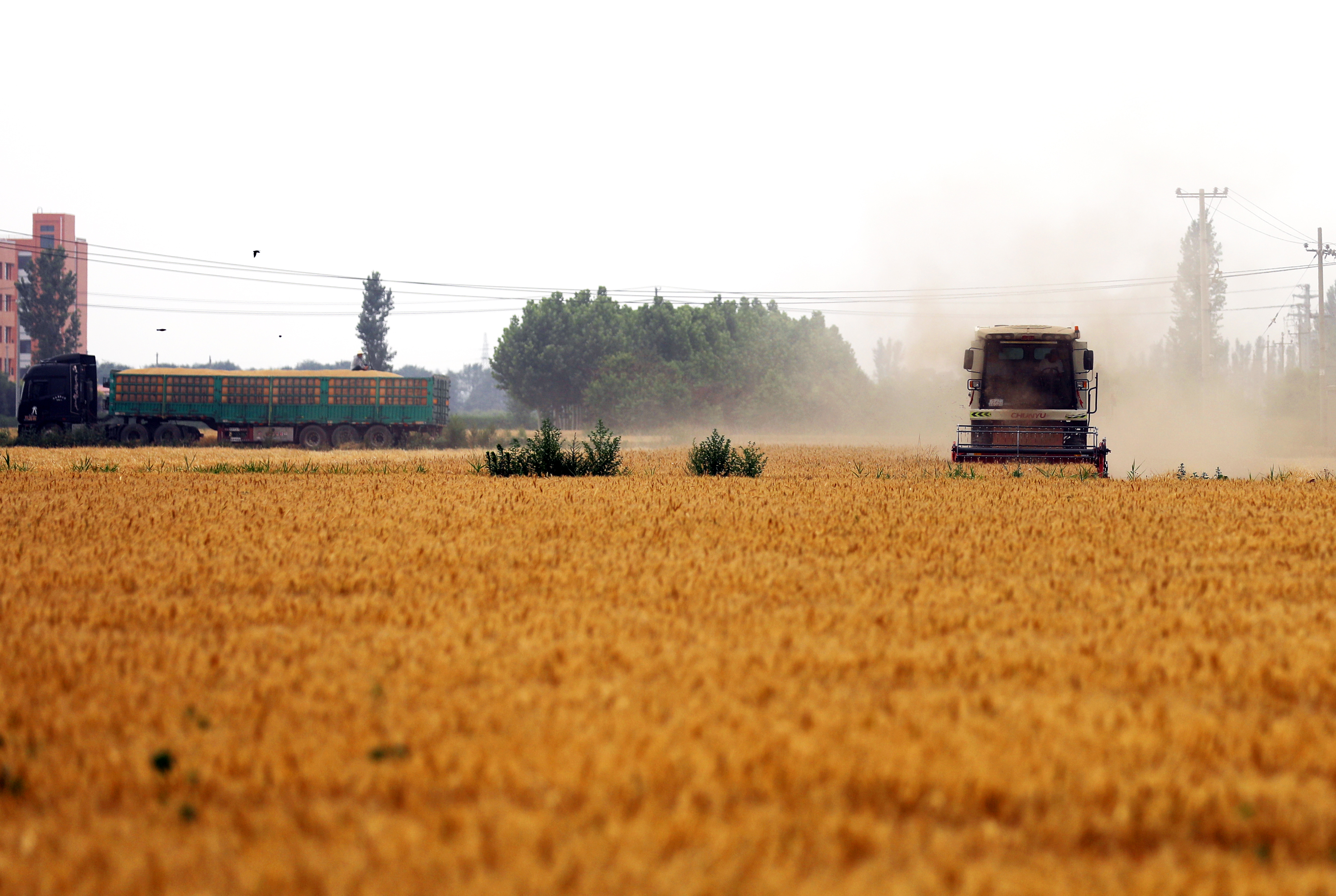 风吹麦田千层浪,暑气蒸腾麦收忙。6月9日,炽热的阳光炙烤着桃城区郑家河沿镇南沼村的千亩麦田。6台联合收割机正披着热浪正来回穿梭,宽大的切割器划过麦秆,整排麦穗应声卷入滚筒,金黄的麦粒如瀑布般砸进车厢,车厢内很快堆起金灿灿的“小山”。田埂上,运粮的半挂卡车安静地等待着,阳光掠过金属车厢,折射出一束耀眼的光芒。