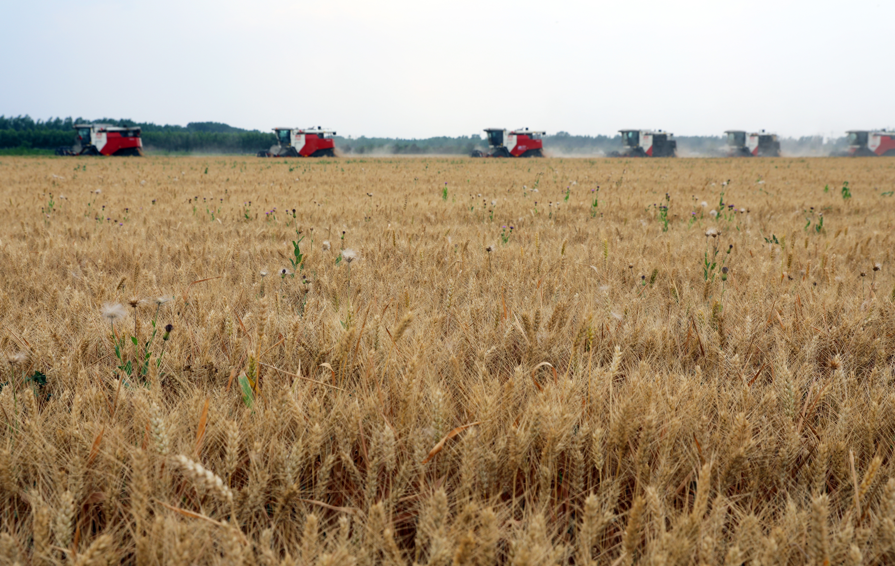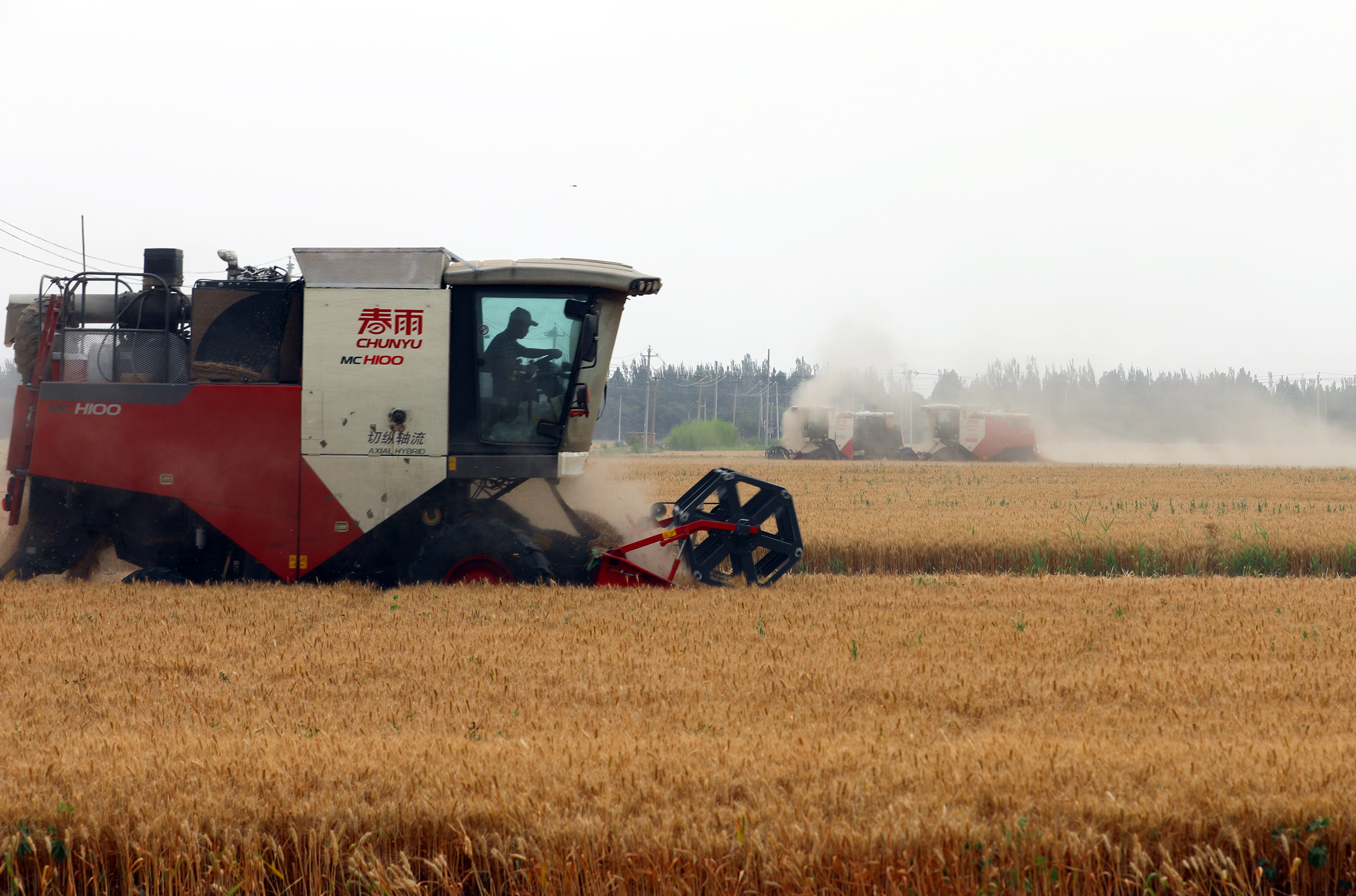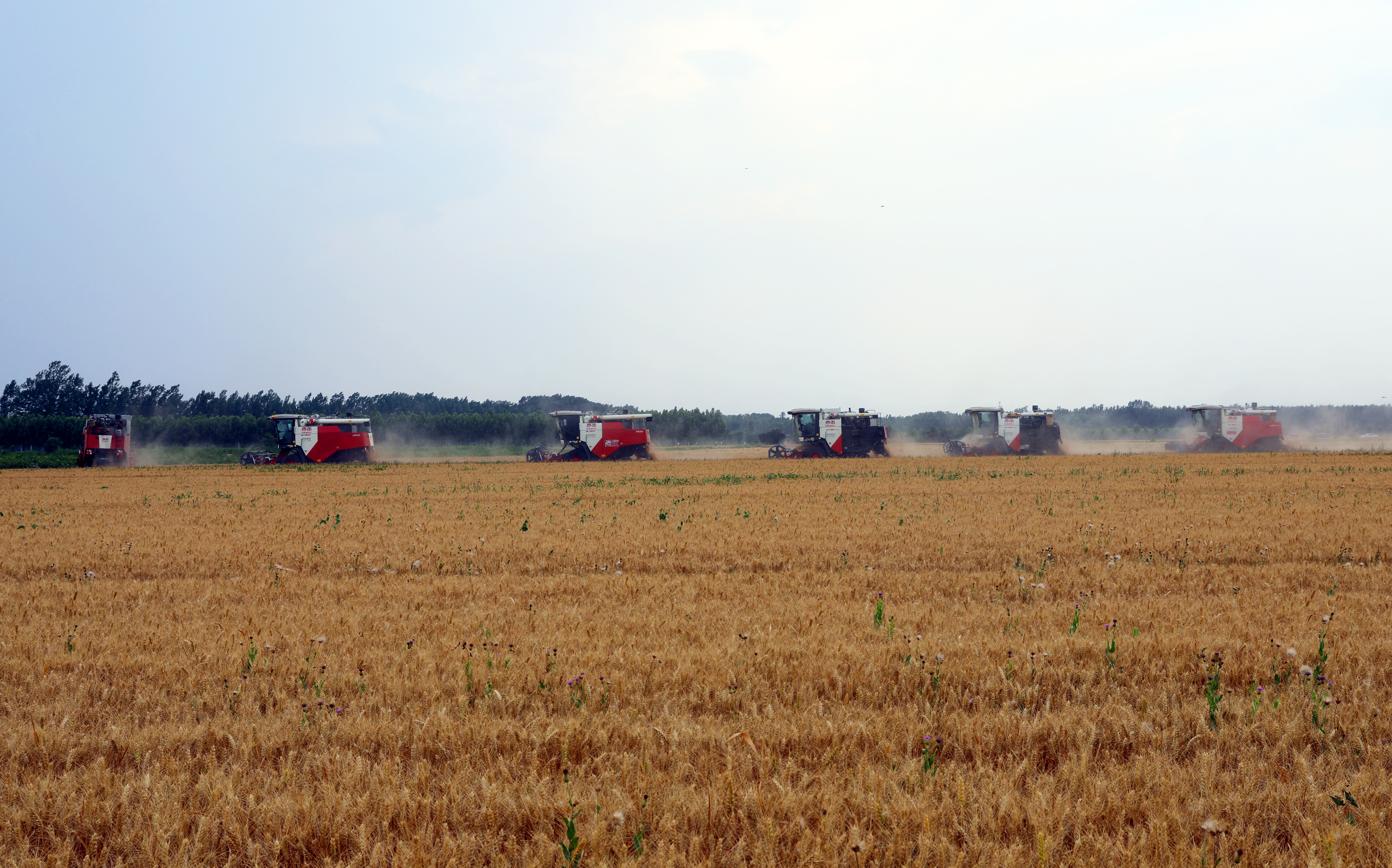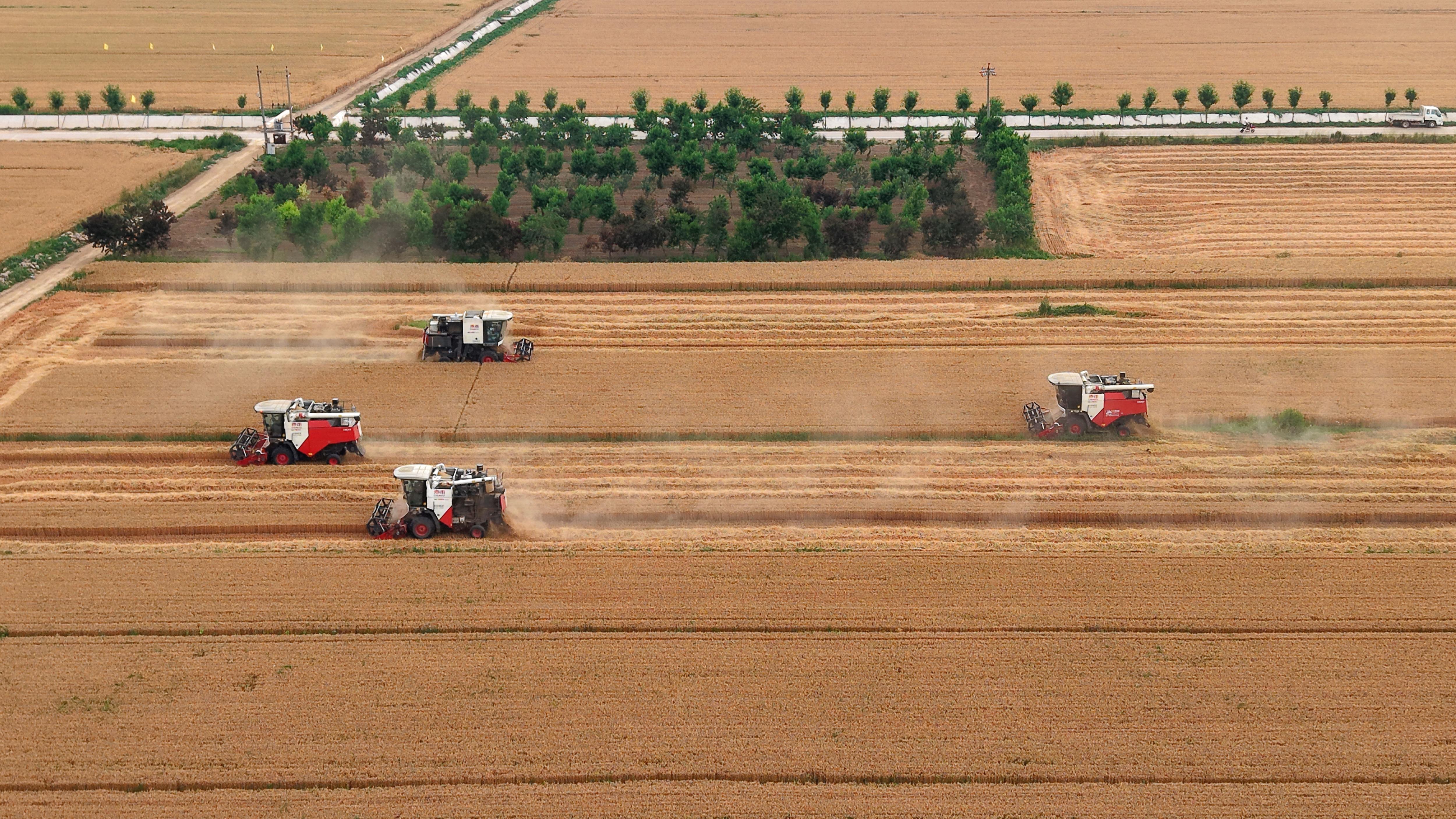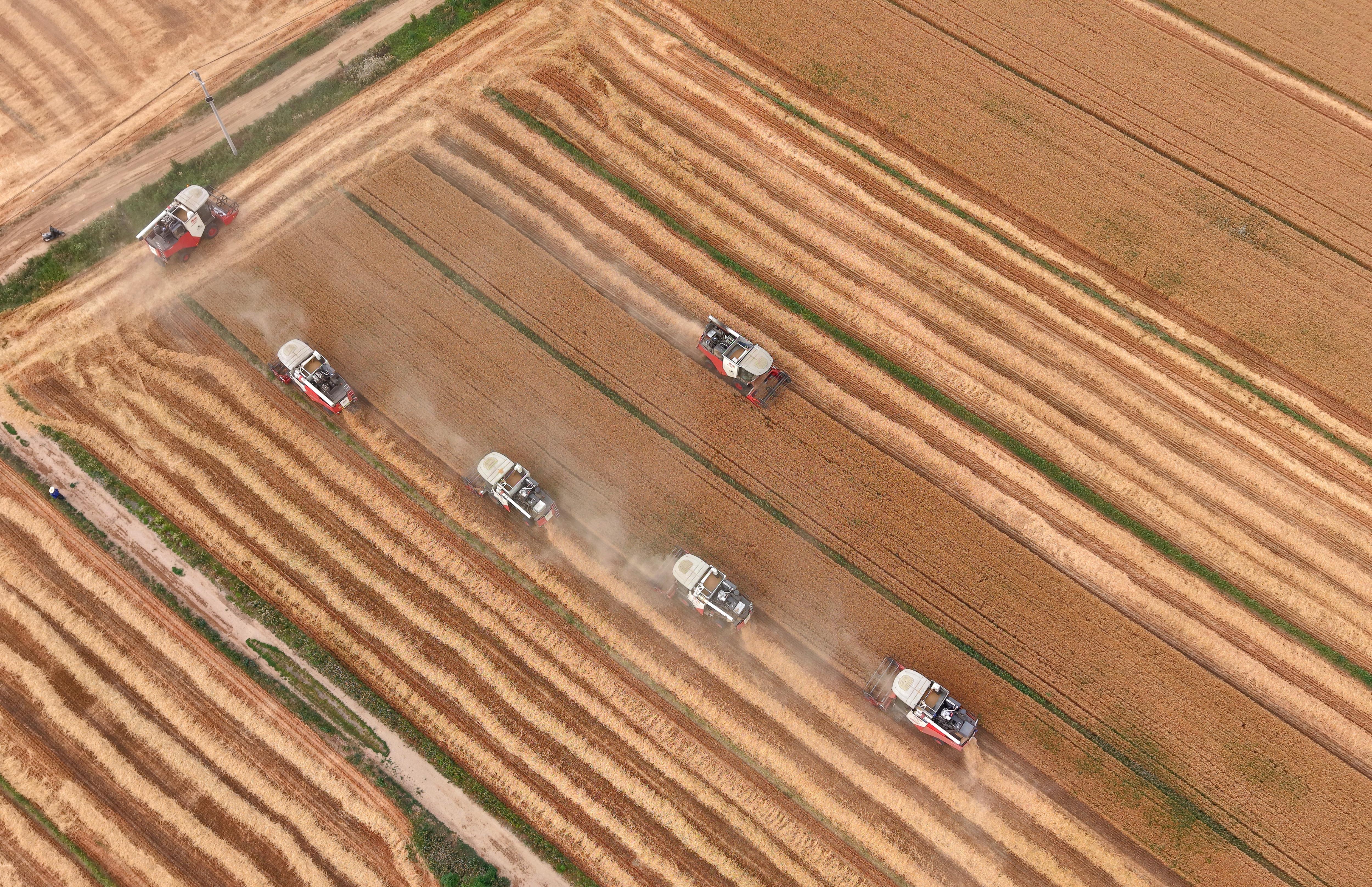 种粮大户李英华站在田埂树荫下,随手用毛巾擦了把额头的汗,望着眼前的景象难掩笑意:“你瞧这麦穗,颗颗都鼓囊囊的!这是我们第二年种小麦,今年雨水合适,管理也跟上了,收成比去年好多了!”他所在的桃城区英秀谷物种植专业合作社种植着1926亩小麦,“6台机子一起干,两天半就能收完!收完马上种玉米,一点儿不耽误!”