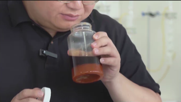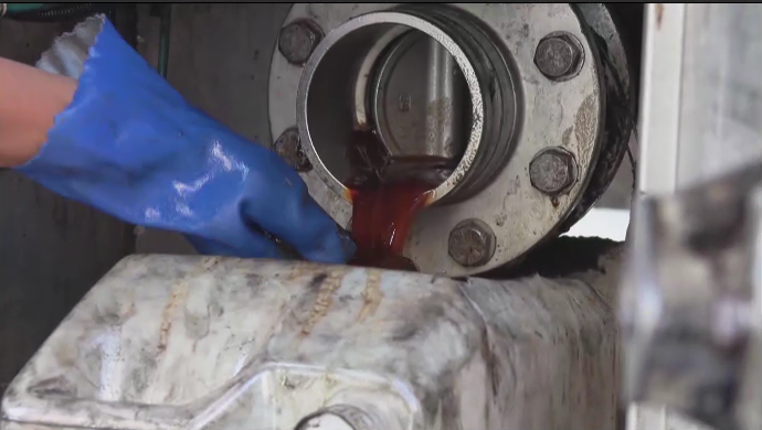 记者:餐厨废弃油的种类有很多,有我们常见的泔水油、炸货油、锅台油,还有地沟油,而且根据每个地方的饮食不同,油品的差别也很大,这瓶油是来自四川,里面是浓郁的火锅的味道,麻辣味。