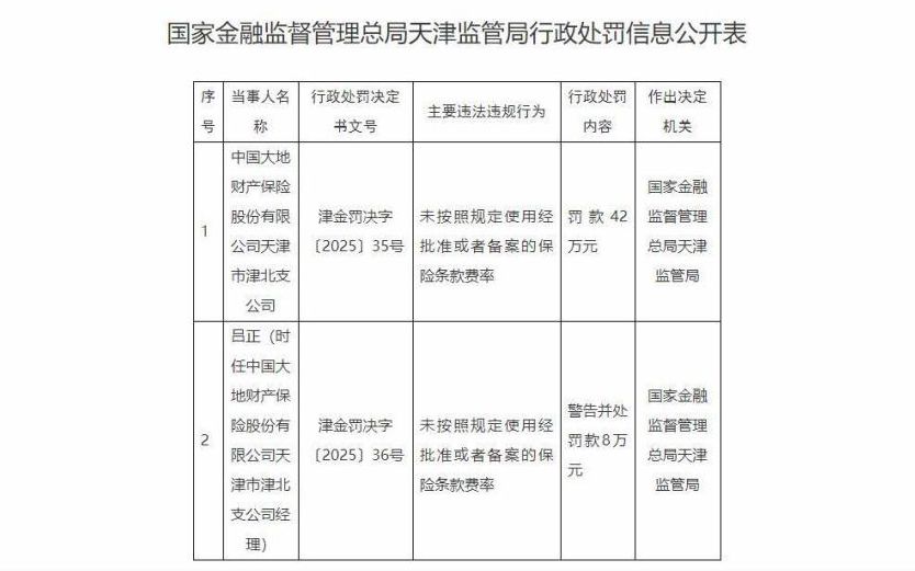 时任中国大地财产保险股份有限公司天津市津北支公司经理吕正受到警告并被罚款8万元。