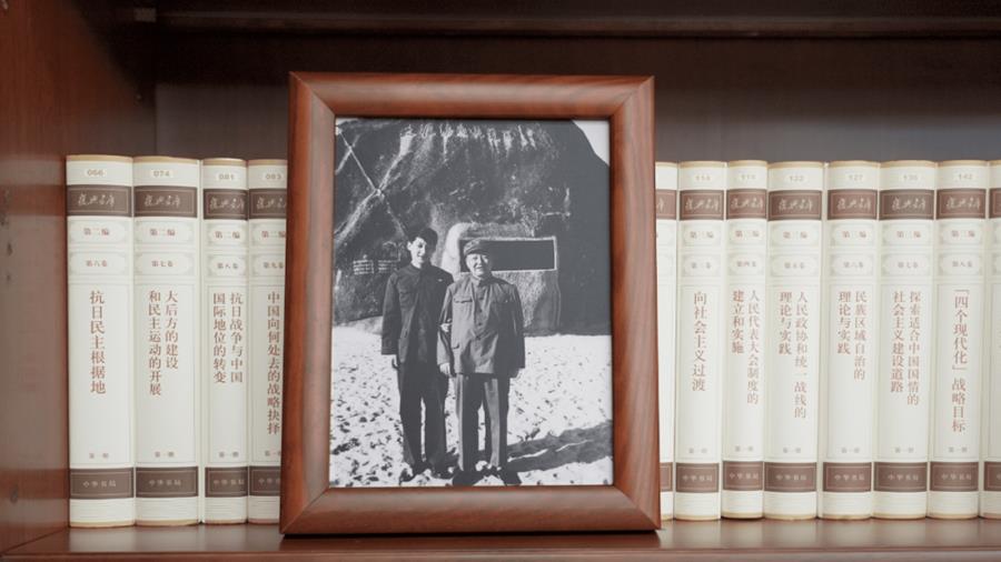 △2022年12月31日,习近平总书记办公室的书架上摆放着他和父亲的合影。