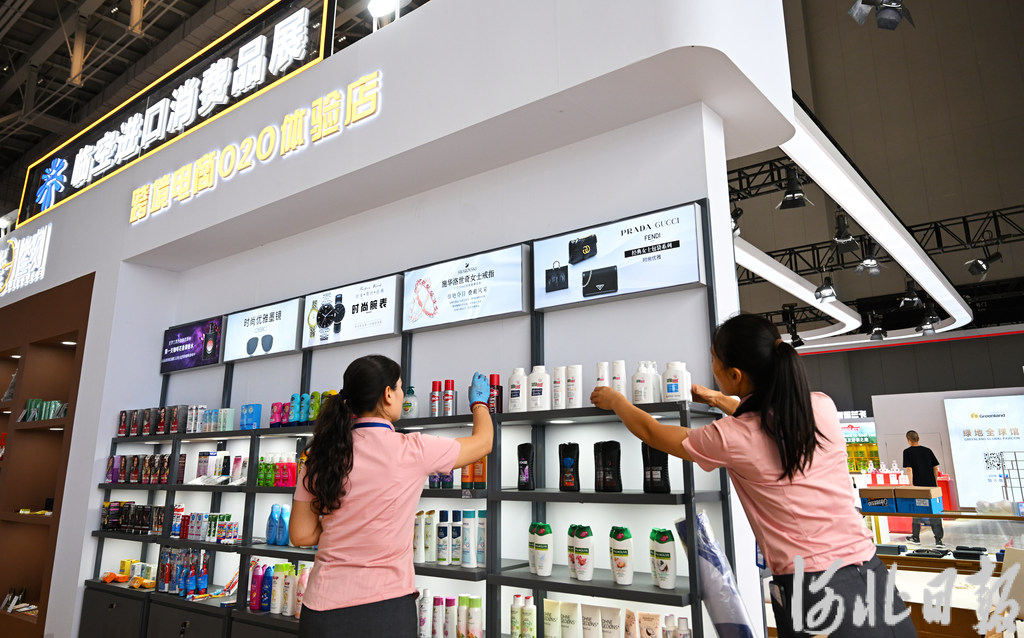 6月15日,工作人员在廊坊临空国际会展中心内外贸一体化进出口商品展区布置展台。河北日报记者 赵永辉摄