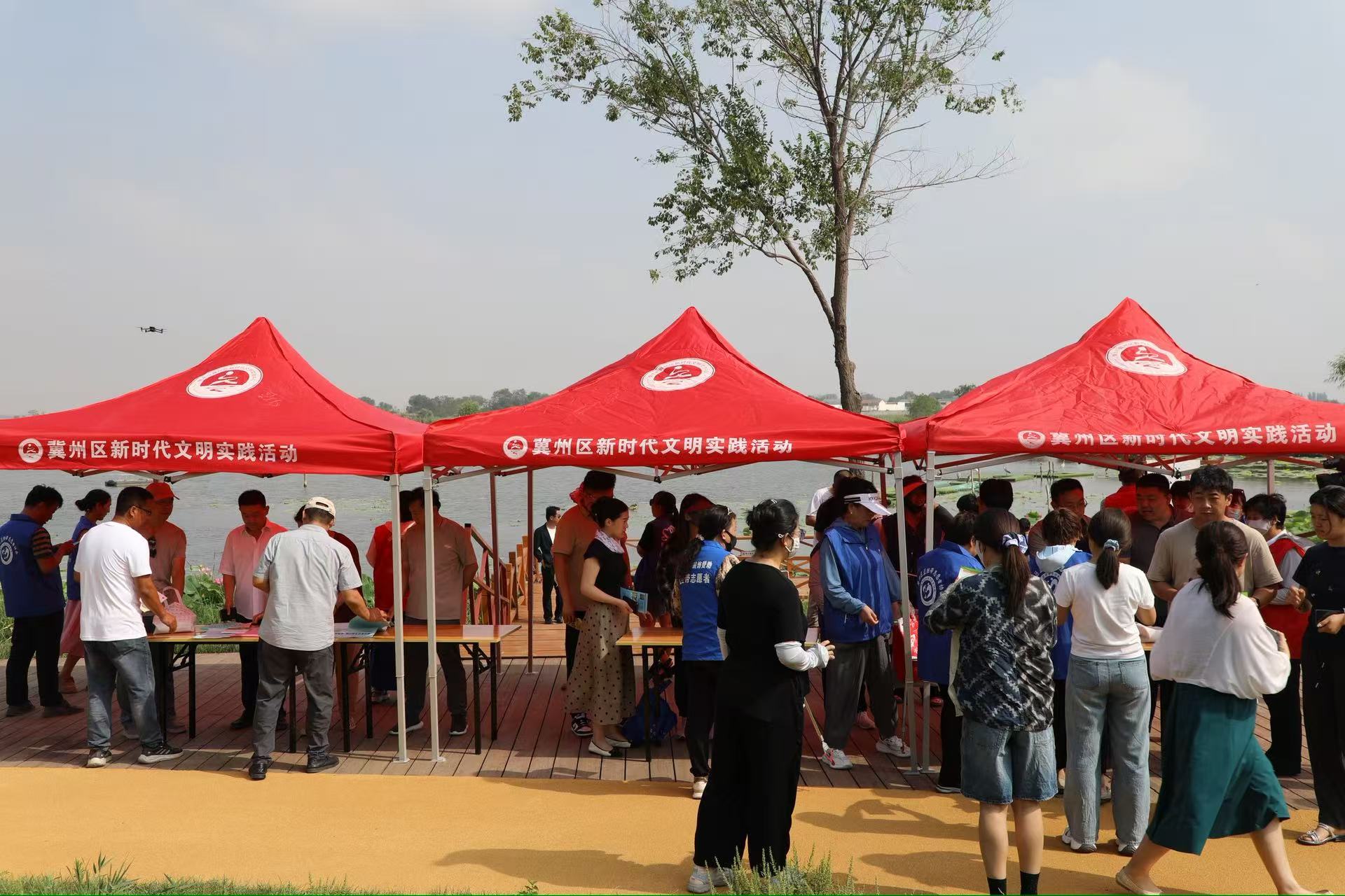启动仪式上,蓝丝带志愿者协会郭春雪宣读了《做文明的环境小卫士》倡议书,号召冀州区市民“小手牵大手”践行文明礼仪,守护优美环境,积极参与文明公益活动。活动中,冀州区检察院、冀州区农业农村局、冀州区自然规划局等部门联合开展文明集市宣传活动。参加此次活动的志愿者们纷纷戴上手套,拿着捡拾器,从古城遗址公园出发,绕着古城遗址文旅路线,开启“家门口”文明实践打卡活动。