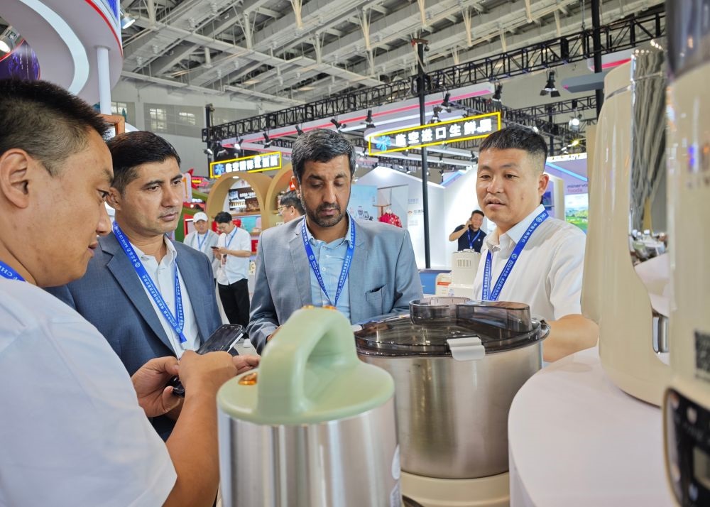 6月16日,外国参观者在2025年中国·廊坊国际经济贸易洽谈会多业态融合消费市集展区选购商品。新华社发(刘向摄)