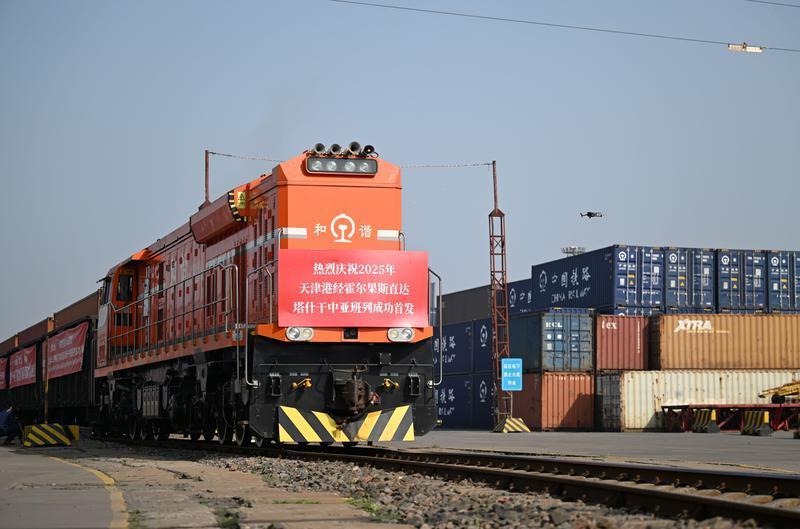 △5月20日,2025年首列天津港经霍尔果斯直达塔什干的中亚班列从天津港物捷三堆场发车。