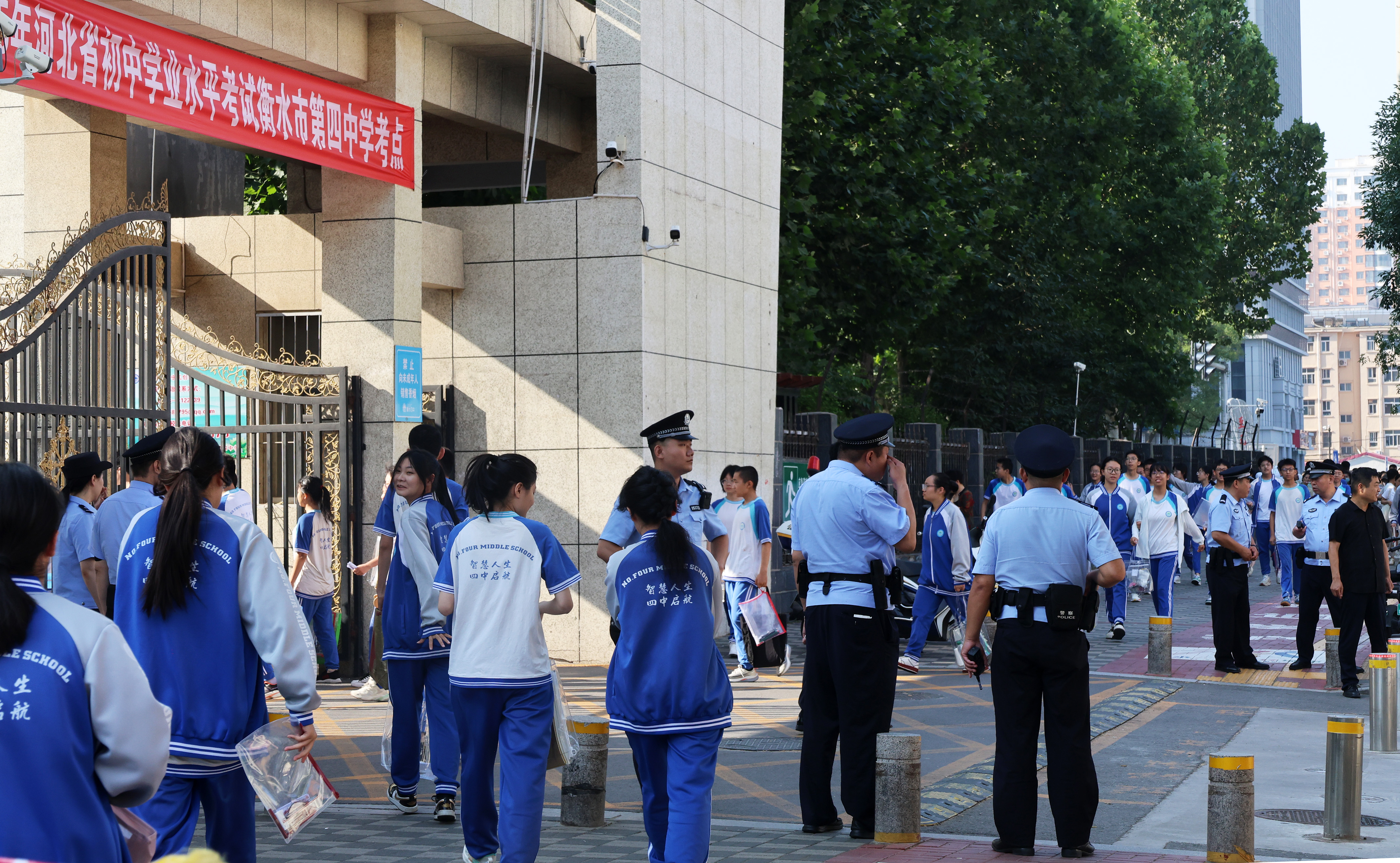 早晨7时30分,衡水市第九中学考点外温情满溢,送考老师与家长们为考生送上殷切祝福,交警、巡警等工作人员维护考点周边的秩序,为考生们营造一个安静的考试环境。