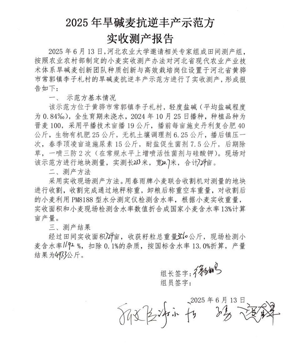 经过专家组测定,示范地最高亩产达497.3公斤。河北农业大学教授刘冬成激动地说:“去年我们河北省黄骅地区产量就在500斤左右,今年气候条件好,再加上各种技术,能够到高产的能达到近1000斤,就等于整个翻了一番。”这一优异产量表现,标志着盐碱地小麦产能得到了有效提升,为旱碱麦产业提质增效和盐碱地综合利用提供了坚实的科技支撑。