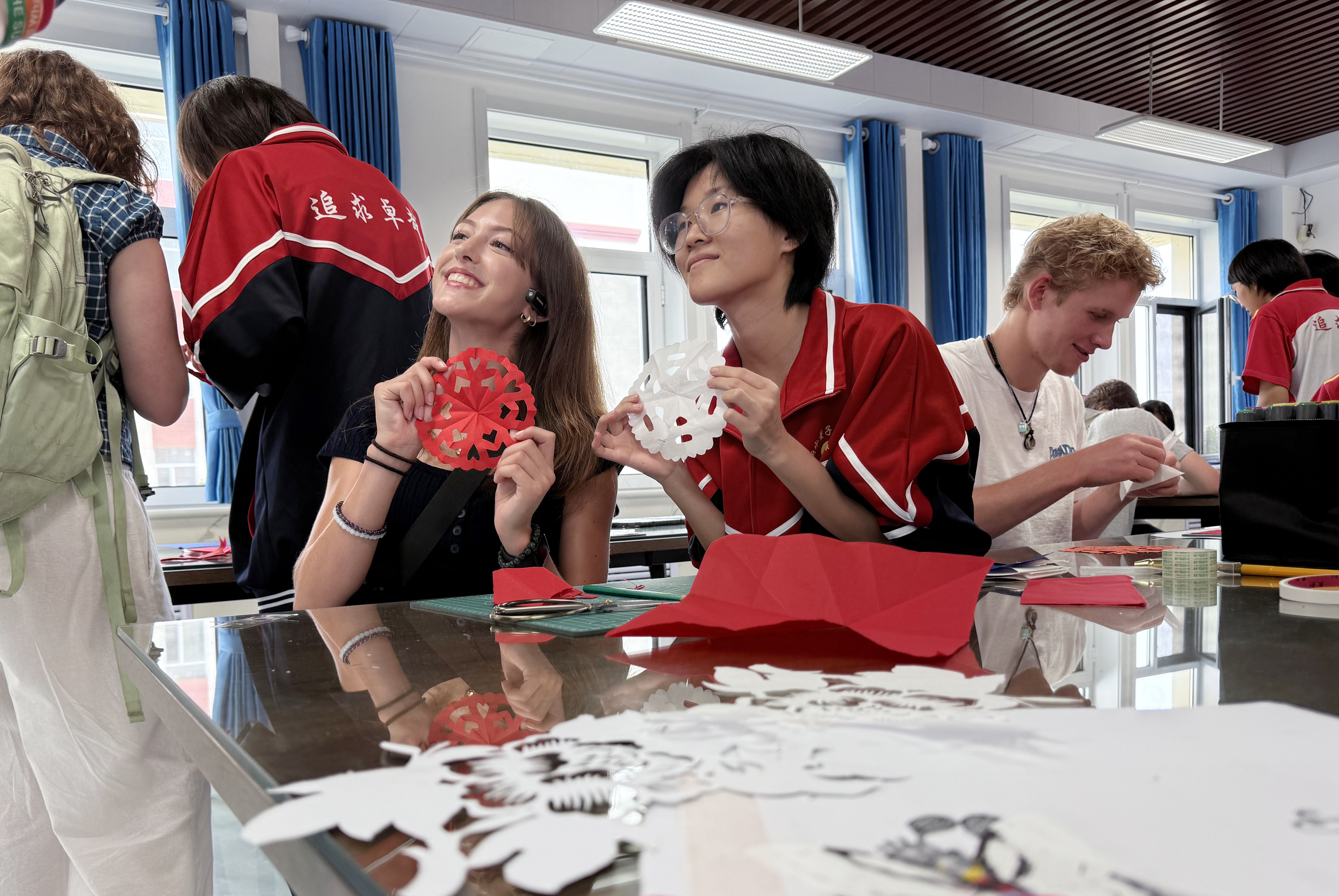 6月19日,交流团抵达河北枣强中学。校方以腰鼓、舞龙舞狮等传统民俗表演热情迎接。在开放式课堂环节,校方代表详细介绍学校教育理念与办学成果,并组织大家参观筑梦园、校史馆。美方学生还参与了剪纸、漆扇、面人等特色社团课程。来自美国加利福尼亚州的学生Truman Skoy(黄珈磊)兴奋地说:“这次交流活动非常精彩,中国不仅自然风光秀丽,民众也十分友善。”在“分享青春 共享未来”主题交流中,中美学生围绕文化传承展开探讨:美方分享感恩节社区活动,中方展示书法作品;在文体互动环节,篮球友谊赛混合组队竞技,艺术教室共同创作文化主题作品,充分展现文化交融成果。