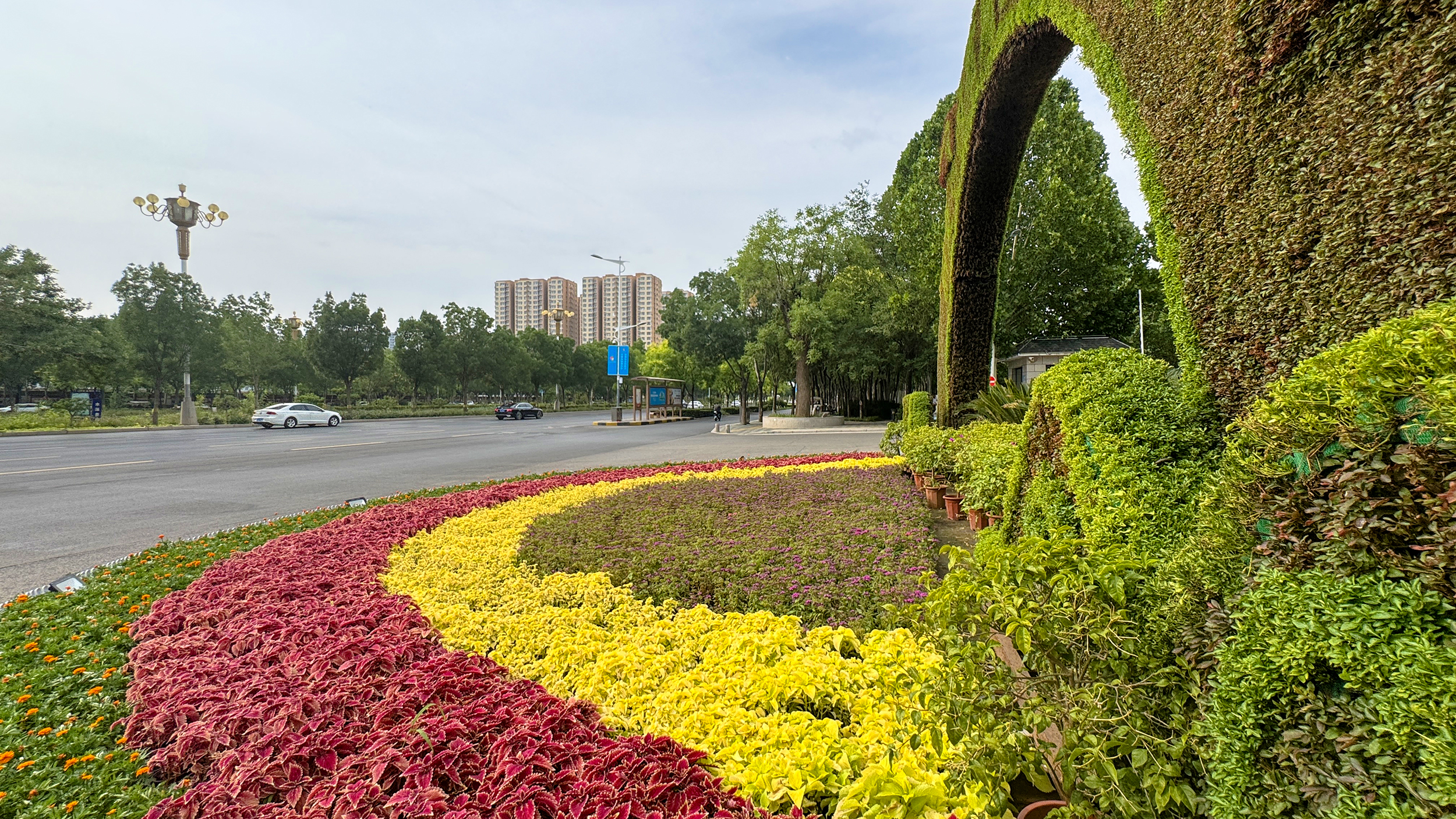 继续前行,在前进大街与滏阳路交叉口附近,有一座高7.8米的“绿色交响”大型立体绿雕。绿雕以五彩飘带为主景,寓意着衡水市绿色发展的新面貌。绿雕周围簇拥着十几种时令花卉,它们或万彩斑斓,或清新典雅,或绿意葱茏,为绿雕增添了更多的生机与活力。