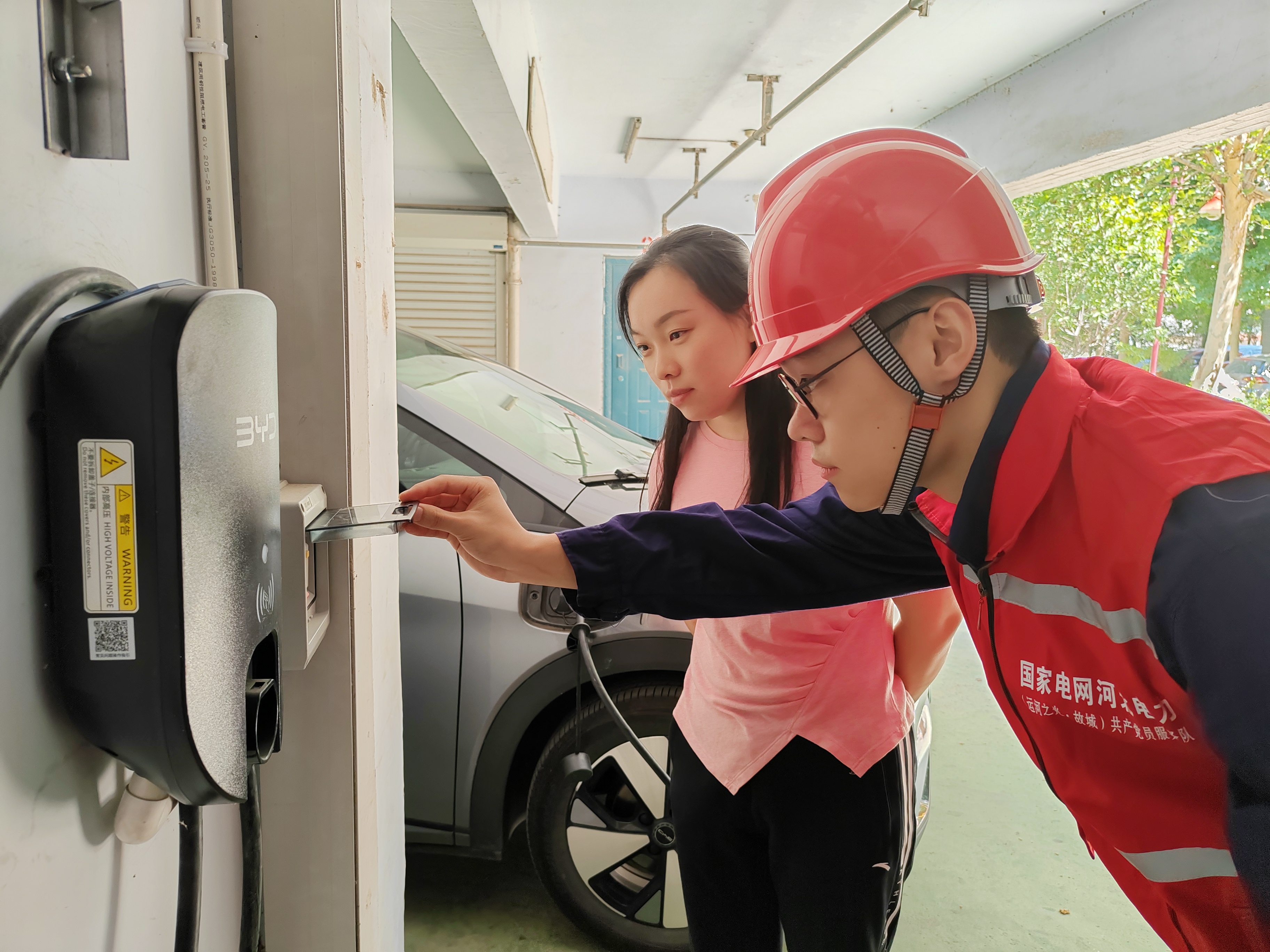 国网故城县供电公司的工作人员帮助新能源汽车业主检查充电桩运行情况。 王勇 摄