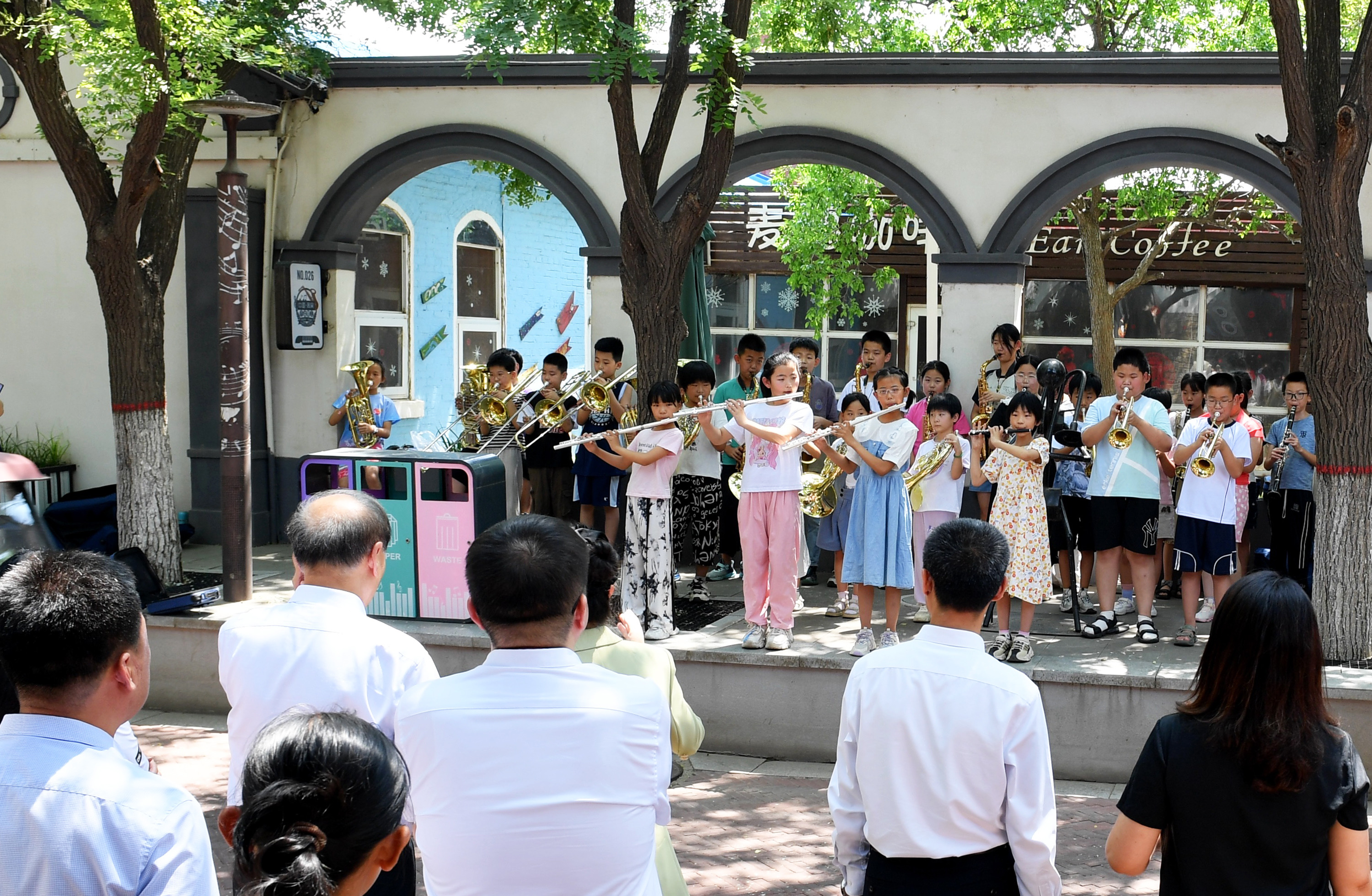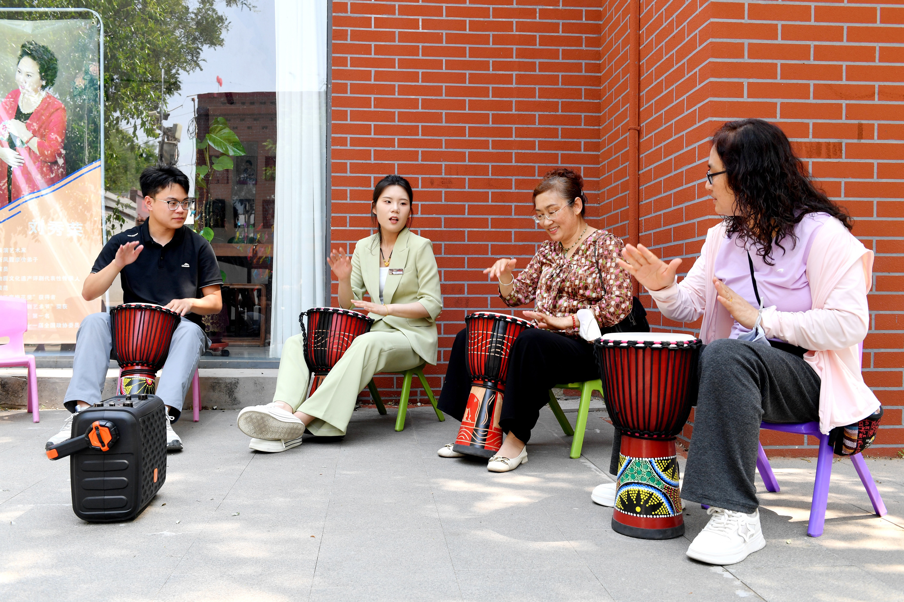 在周窝音乐小镇,浓厚的音乐氛围扑面而来。乐手们自发组成演奏小组,分散在绿荫环绕的街巷中进行表演。《爱拼才会赢》《搀扶》等经典曲目轮番奏响,悠扬乐声此起彼伏,吸引众多游客驻足欣赏。