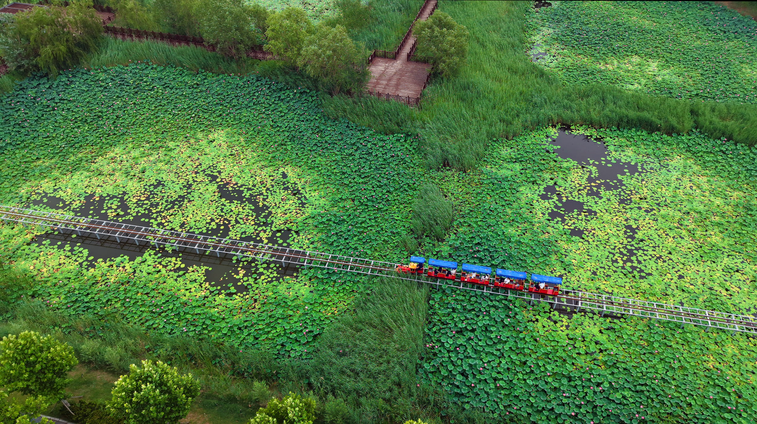 粉白相间的荷花点缀在层层叠叠的荷叶间,随风摇曳,荷香四溢。白鹭、苍鹭等水鸟低空掠过湖面,停歇在荷尖休憩,与娇艳的荷花相映成趣。复古水上小火车穿梭于荷花丛间,伴随汽笛声,游客近距离观赏盛放的荷花,与掠过车厢的飞鸟“邂逅”。造型各异的游船在湖面穿梭,游客乘坐其上随水波荡漾,感受清风拂面惬意,捕捉水鸟滑翔灵动瞬间。