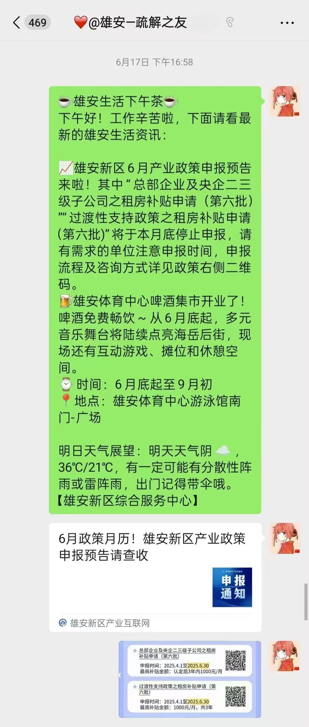 原来,为了更好开展疏解服务,雄安新区综合服务中心于今年初组建了“@雄安-疏解之友”微信群,截至目前群里已有145家疏解单位。在雄安新区综合服务中心的悉心运营下,这个小小的微信群成为连接疏解单位的重要桥梁、服务疏解单位的重要渠道。
