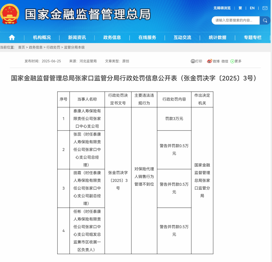 该公司2025年一季度偿付能力报告显示,一季度泰康人寿各级机构累计受到行政处罚6家次,合计受罚金额为59.6万元。泰康人寿省级分公司及以上机构共收到监管函2件,包括国家金融监督管理总局广西监管局向泰康人寿广西分公司下发监管函,指出分公司存在产说会销售误导、财务数据不真实、产说会管理不规范等问题;国家金融监督管理总局巴南监管分局向泰康人寿重庆分公司下发监管函,指出分公司的个别保单存在新单回访无效的问题,并要求分公司认真落实整改,强化内控管理。