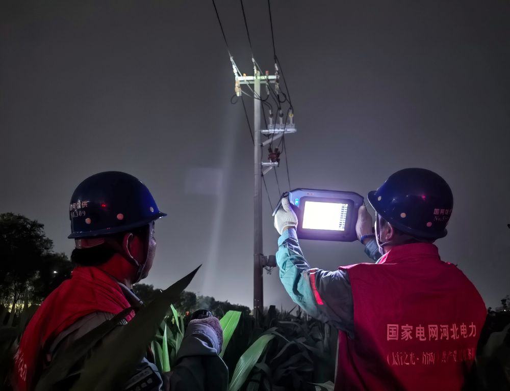 国网馆陶县供电公司工作人员利用夜间时段巡视涉农线路。新华社记者赵鸿宇 摄