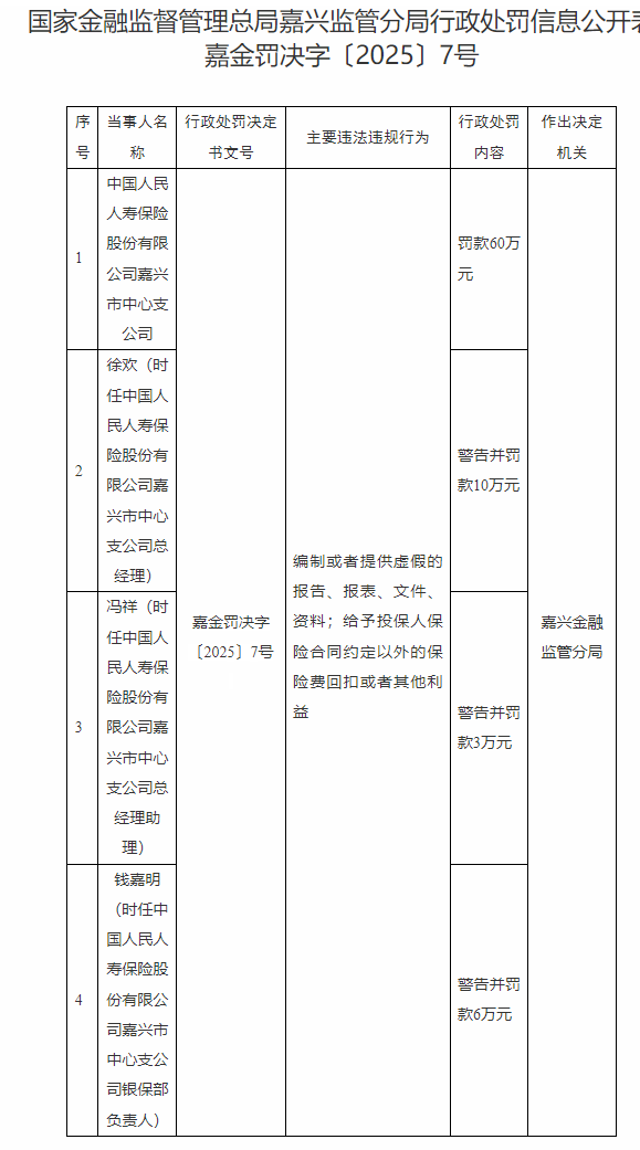7月2日浙江金融监管局发布相关信息:中国人民人寿保险股份有限公司嘉兴市中心支公司存在编制或提供虚假的报告、报表、文件及资料的行为,同时给予投保人保险合同约定以外的保险费回扣或其他利益。鉴于此,嘉兴金融监管分局对该公司处以60万元罚款。