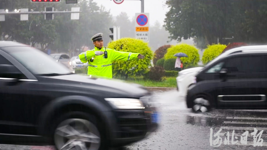 7月2日,在保定市莲池区七一路与恒祥大街交口,交警冒雨疏导交通。 河北日报记者 许佳奇摄