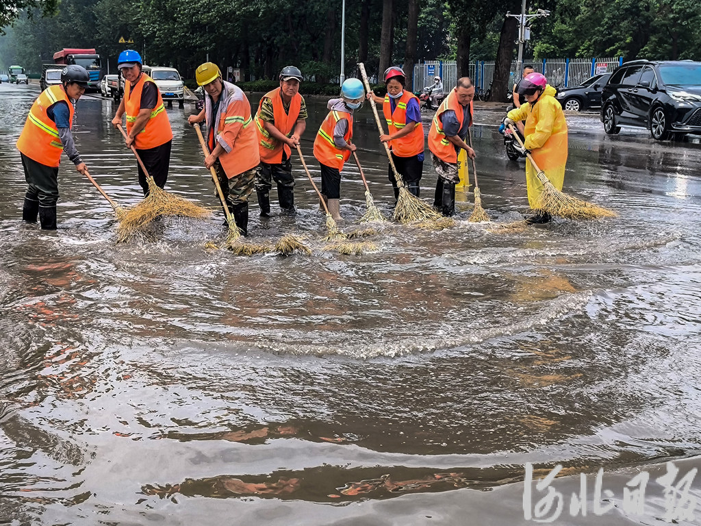 7月2日,石家庄市出现短时强降雨天气,环卫部门第一时间启动道路保洁作业。图为石家庄市新华区环卫大队在石清路开展推扫作业。河北日报记者田明摄
