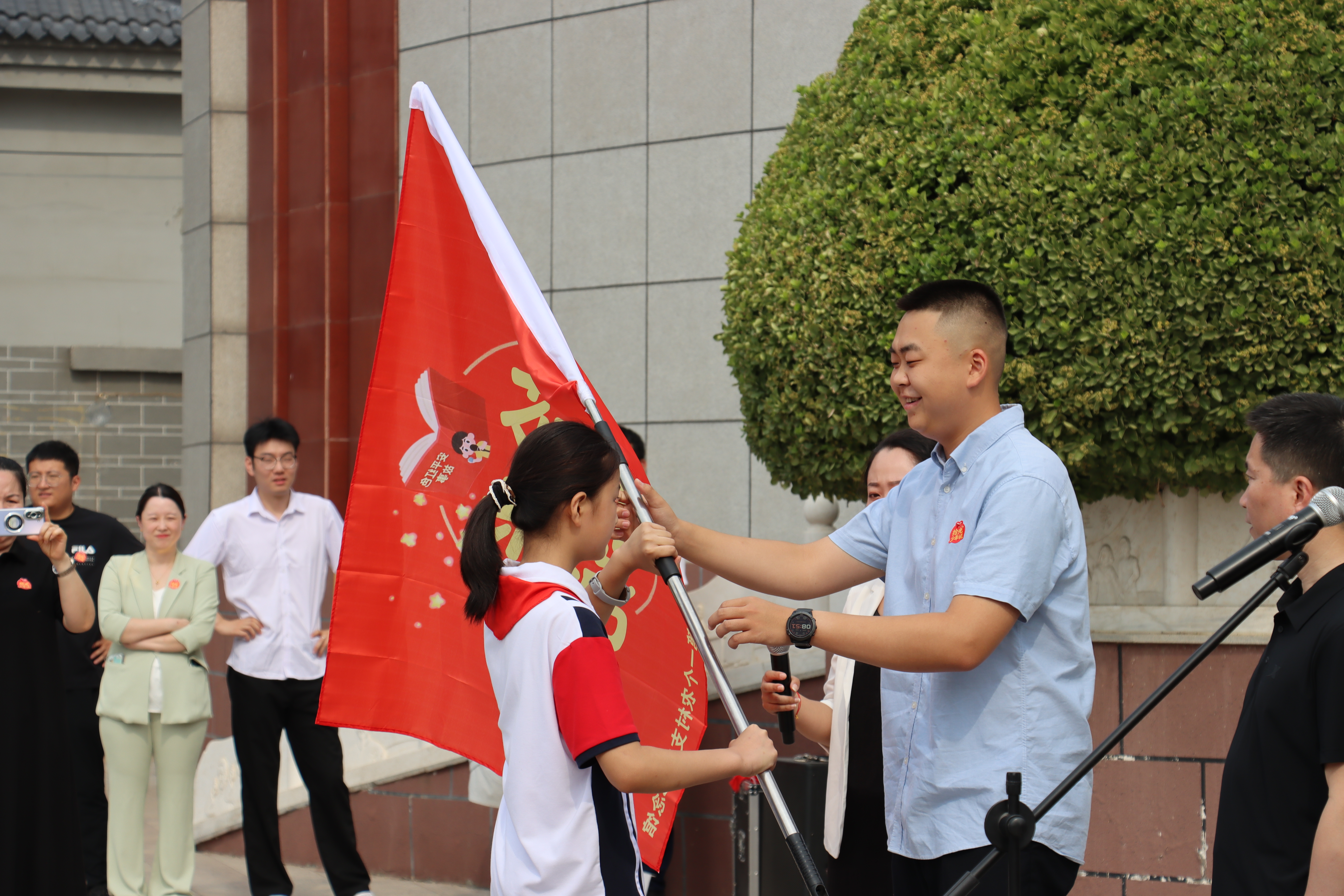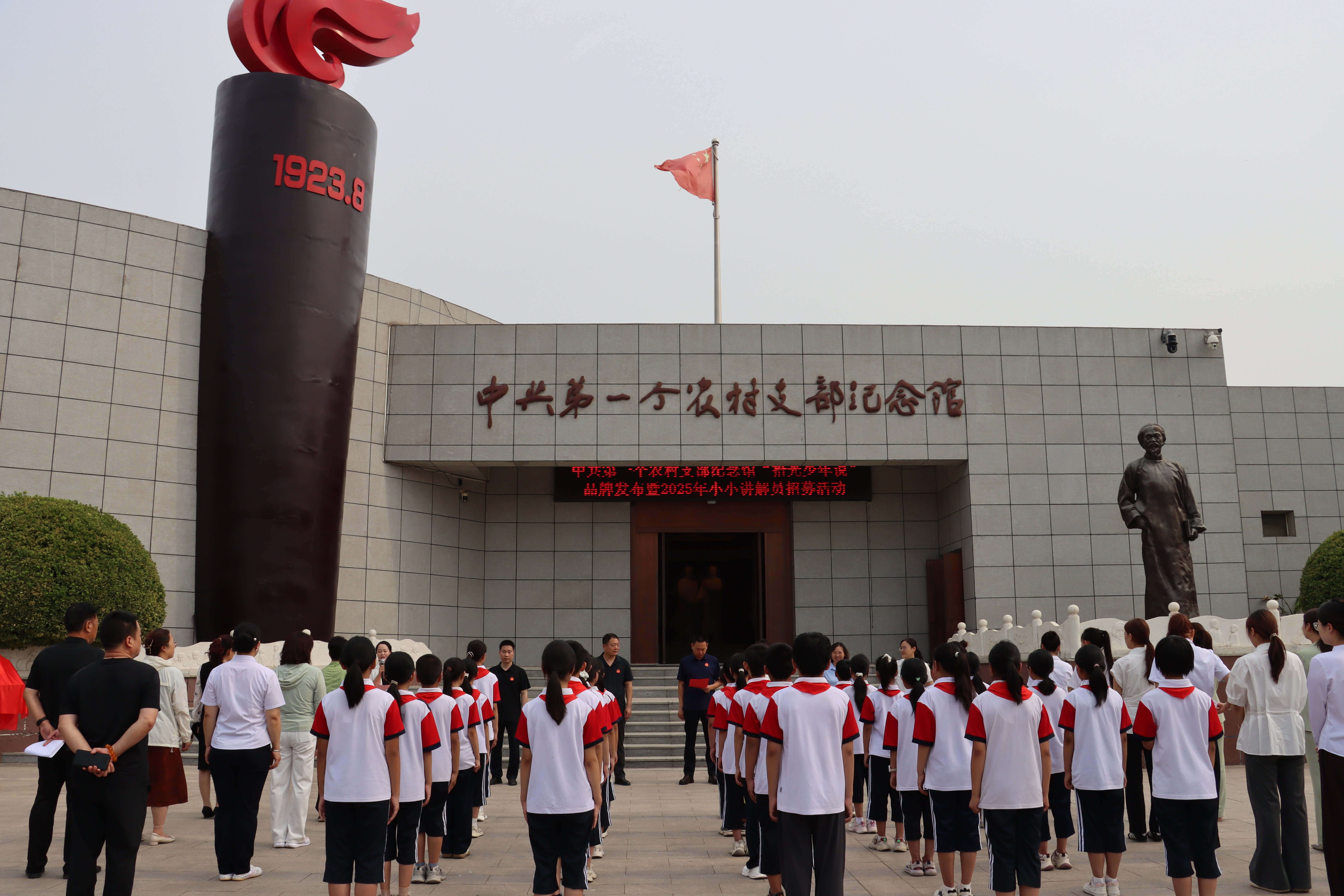 今年是中国人民抗日战争胜利80周年,纪念馆“小小讲解员”全新升级为“拾光少年说”。在品牌发布活动现场,已成为纪念馆专职讲解员的门泽朋,将象征责任的讲解旗郑重交到新一代少年手中。