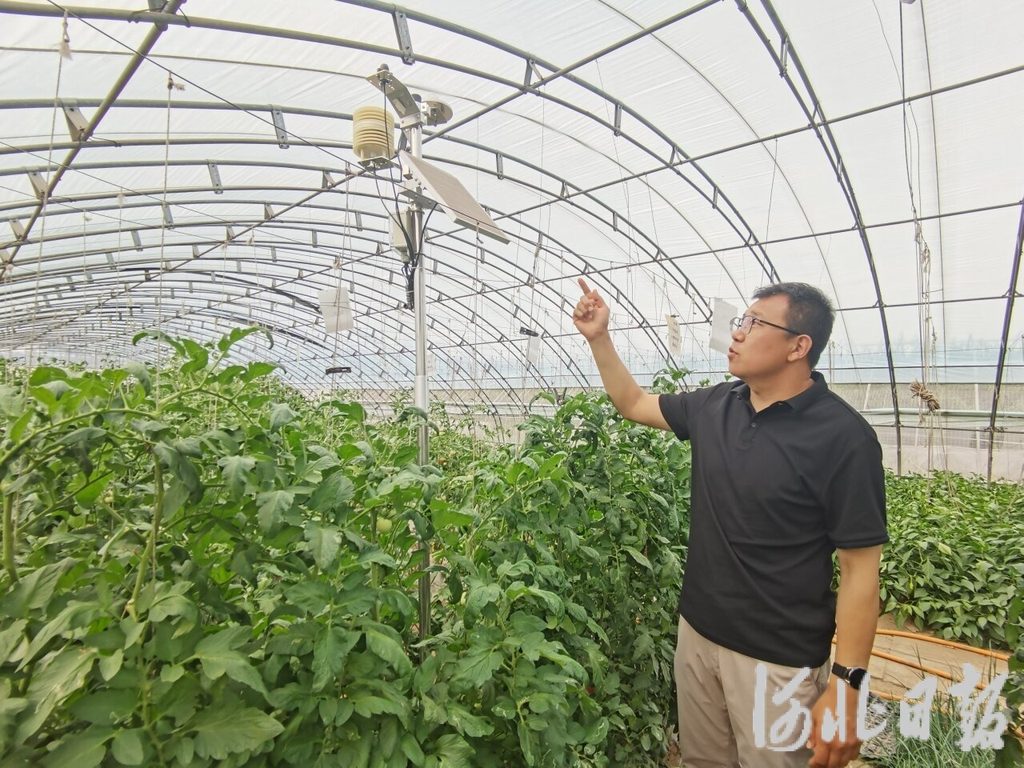 6月23日,在位于石家庄市鹿泉区大河村的省农科院大河实验站,省农林科学院农业资源环境研究所副研究员史建硕介绍棚内的光照强度测量仪。河北日报记者 李冬云摄
