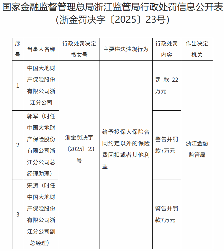 7月7日,国家金融监督管理总局浙江监管局行政处罚信息公开表显示,中国大地财产保险股份有限公司(下简称“大地财险”)浙江分公司因给予投保人保险合同约定以外的保险费回扣或者其他利益,被罚款22万元。